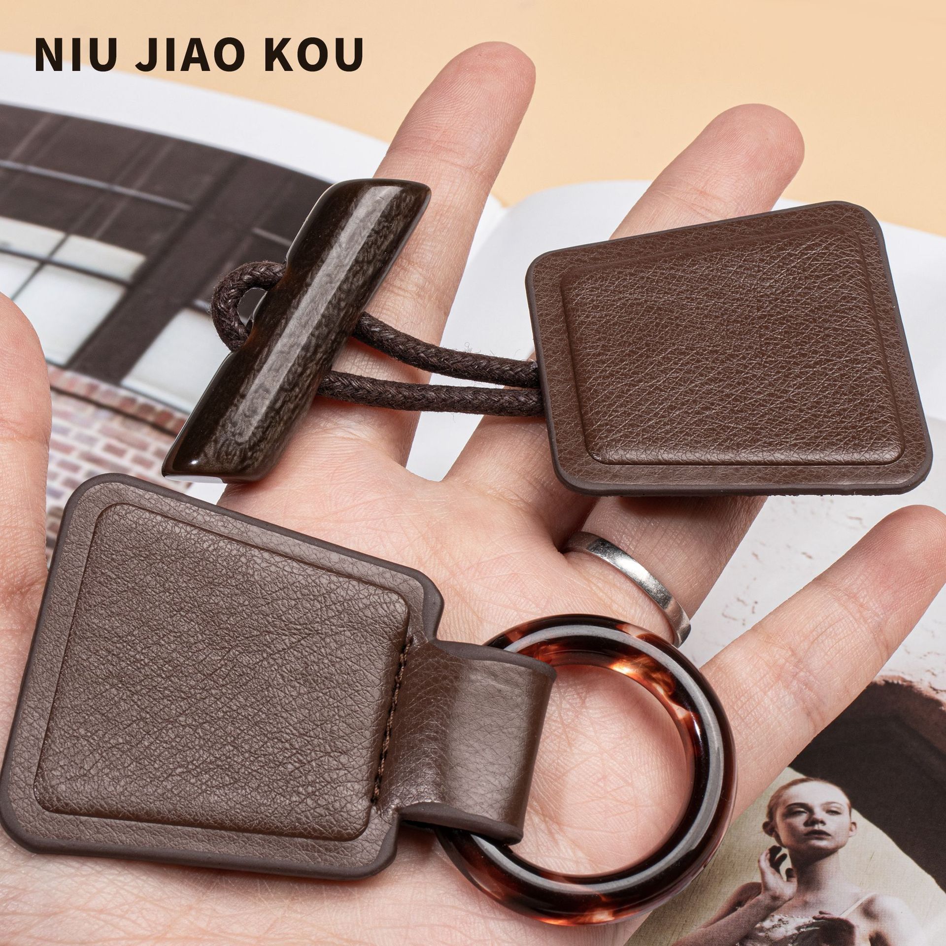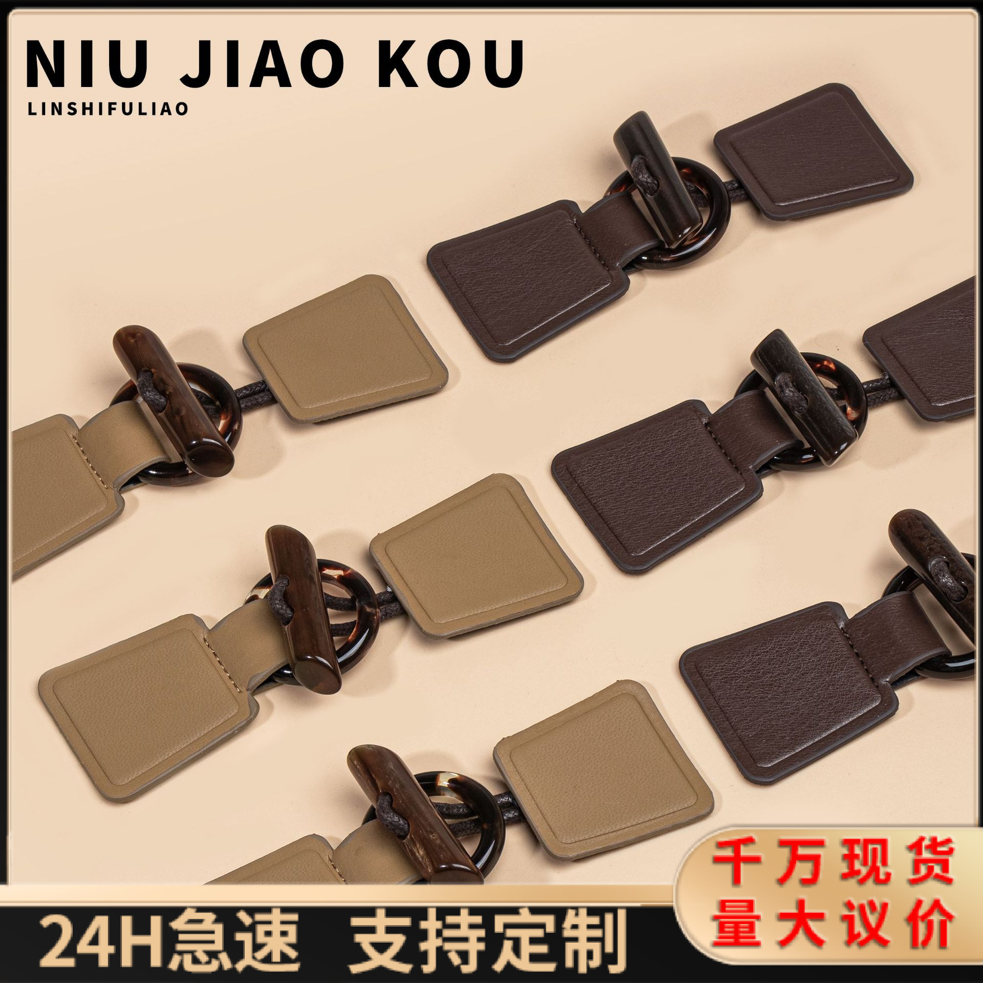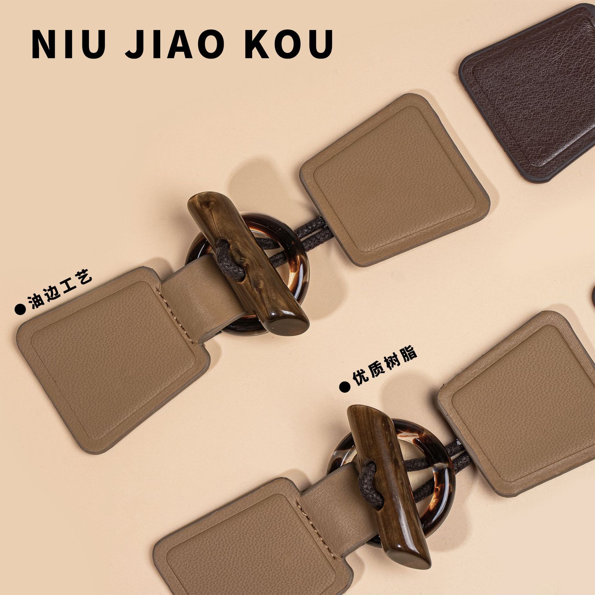 新しい茶色の皮革樹脂のボタンは、コートのコートの毛のコートの正方形のロープのボタンの装飾の手縫いのボタンの卸売りです。