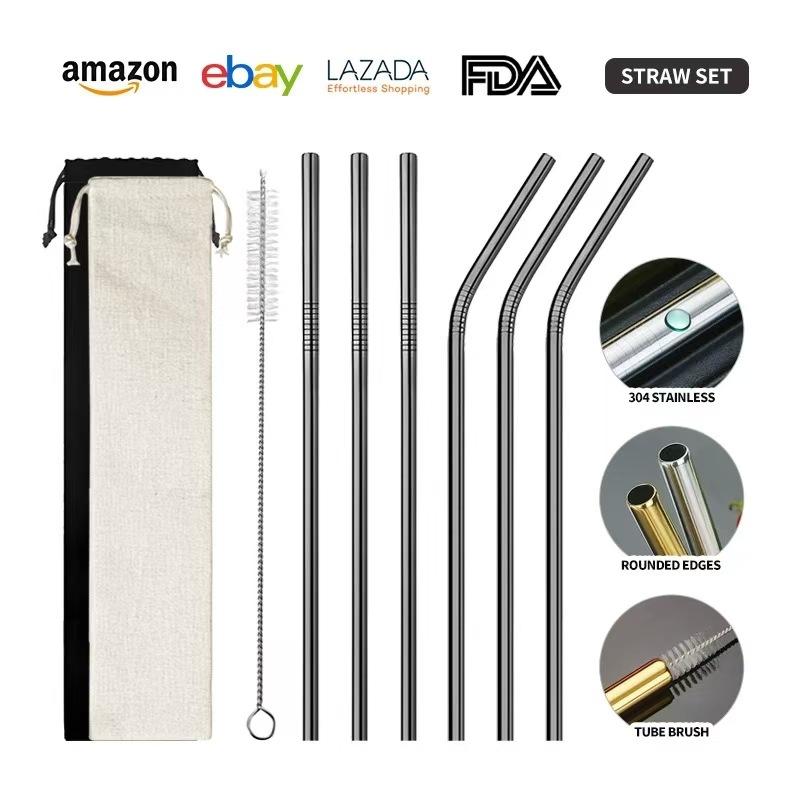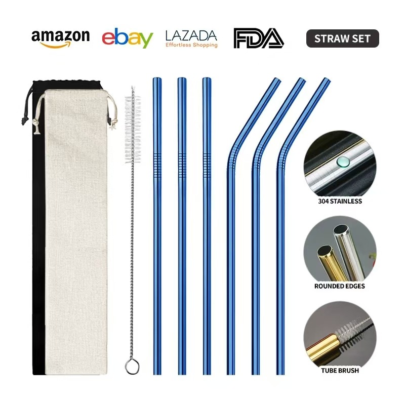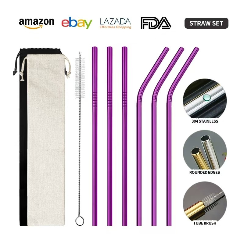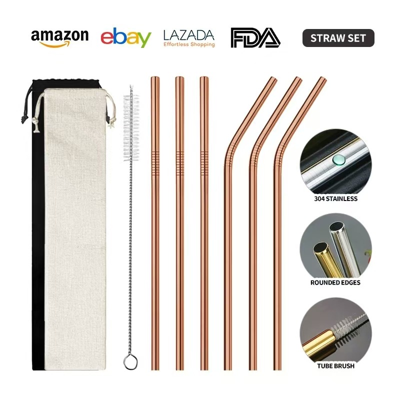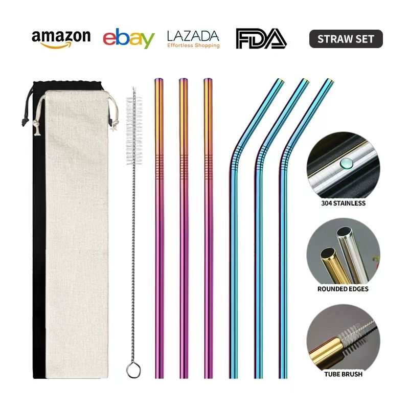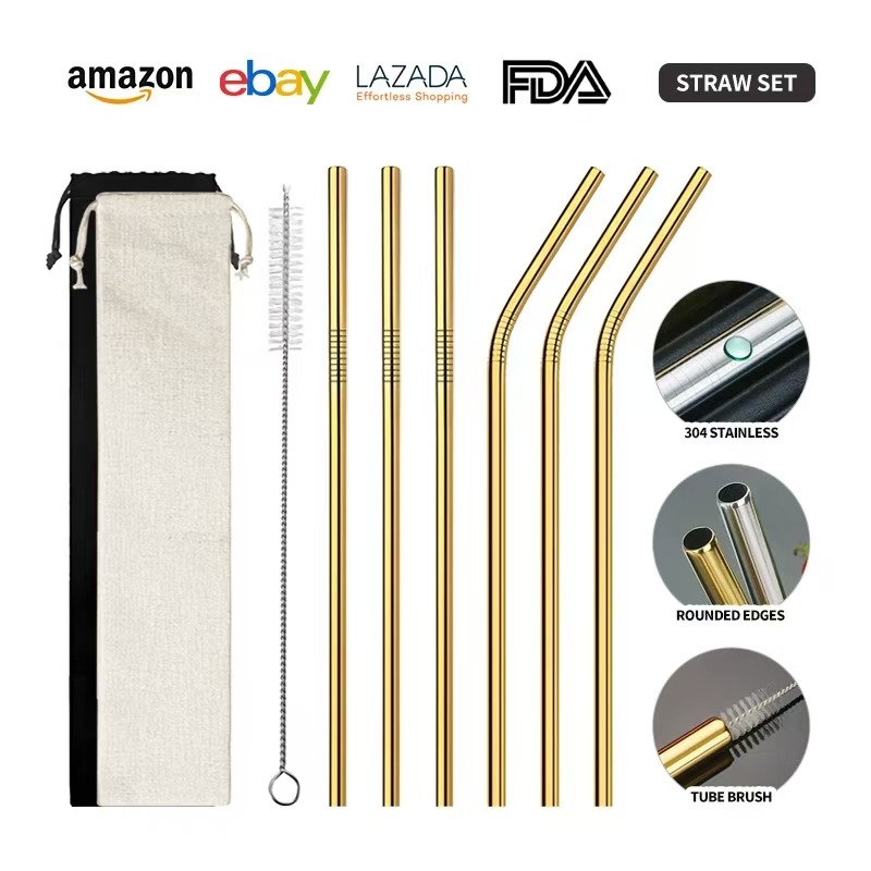 クロスボーダー304ステンレスストロー6点セットチタンメッキカラー直管セットミルクティージュース飲料金属ストロー