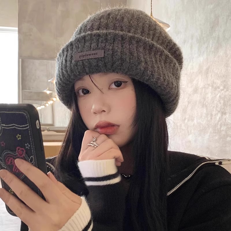 秋冬の女性用日本製多用途暖かいウールパイル帽子、顔が小さく見えるウールの厚みのあるニットの大きな頭囲の帽子