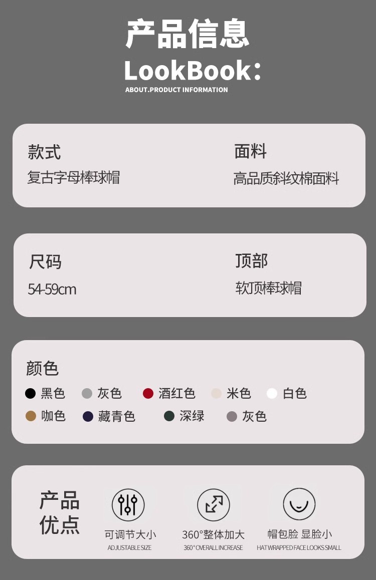 美式复古字母刺绣棒球帽女新款显白显脸小宽帽檐加大加深鸭舌帽子