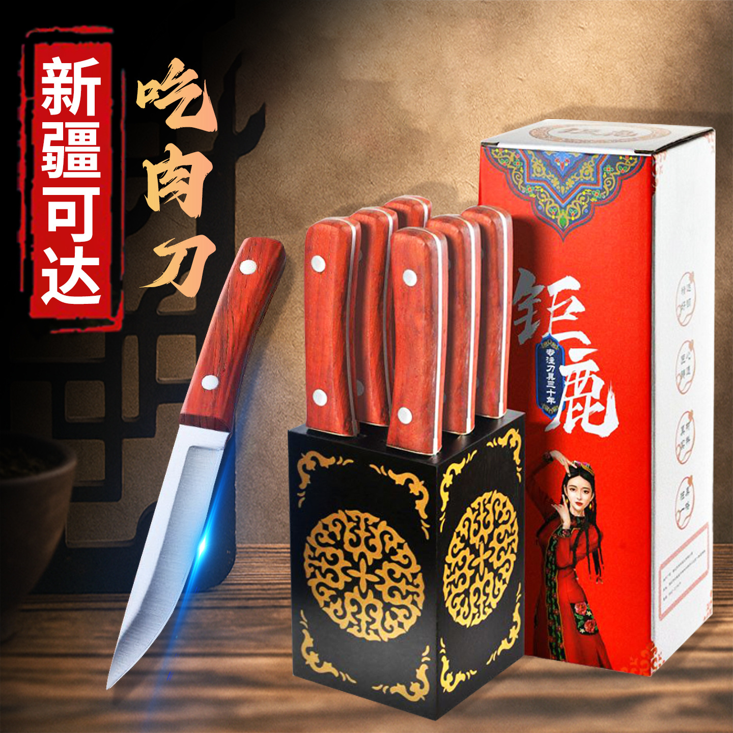 新疆直邮蒙古小刀六件套送实木刀座烧烤吃肉手把刀水果锋利切肉刀