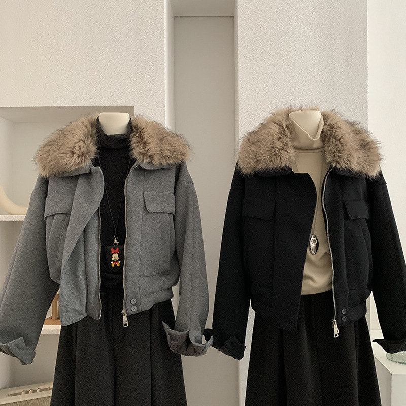 欧玛莱 可拆卸毛领翻领拉链开衫夹棉长袖工装风外套上衣实拍 5310