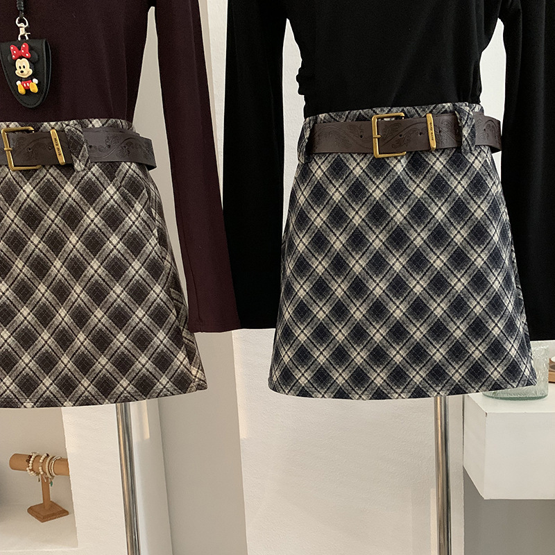 欧玛莱 复古毛呢菱形格子半身裙秋冬季A字显瘦短裙配腰带实拍5357