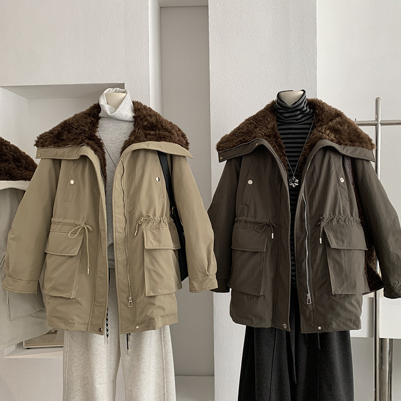 欧玛莱 羊羔毛大翻领派克长袖拉链开衫中长款保暖工装外套女 5601