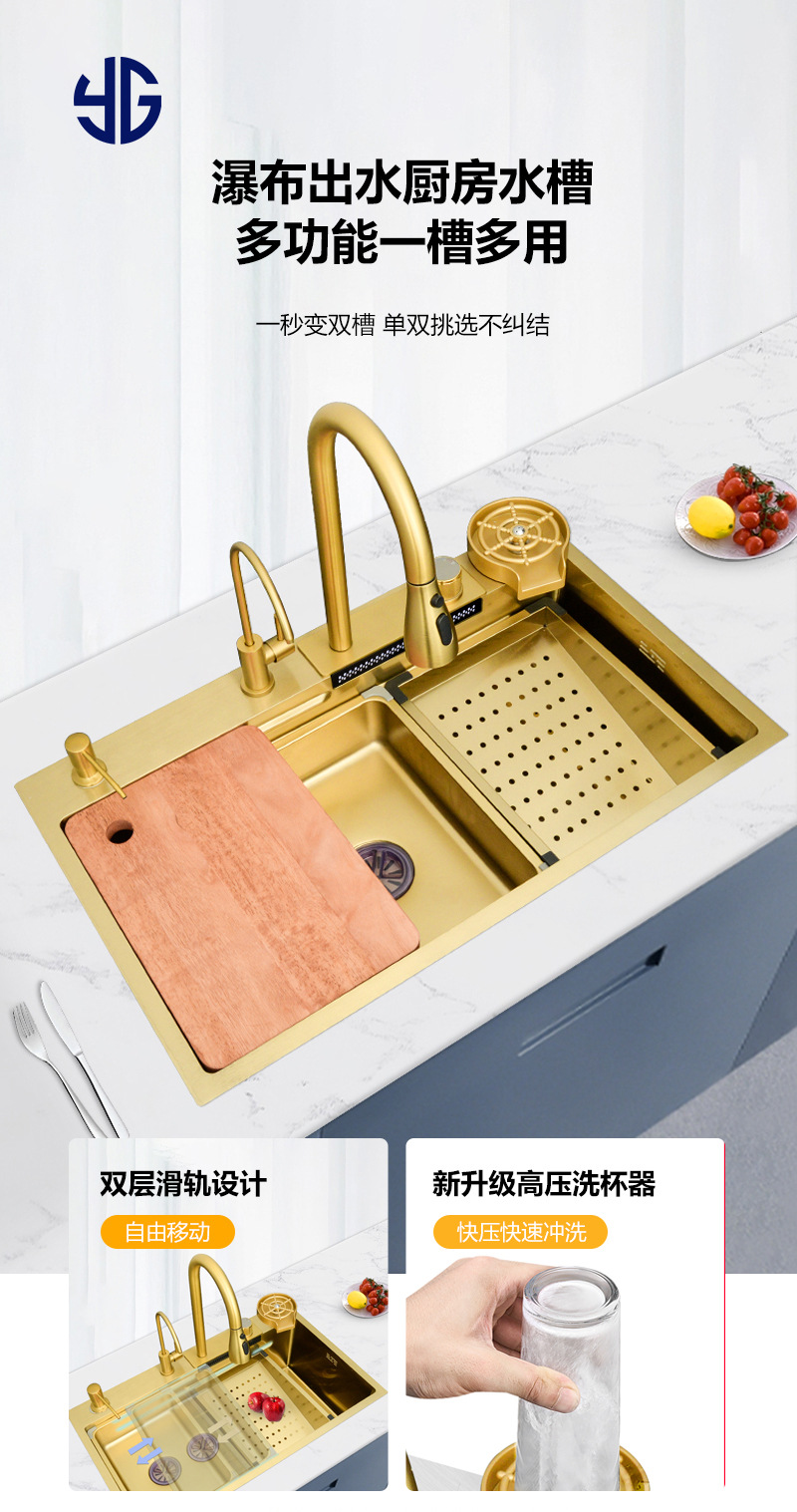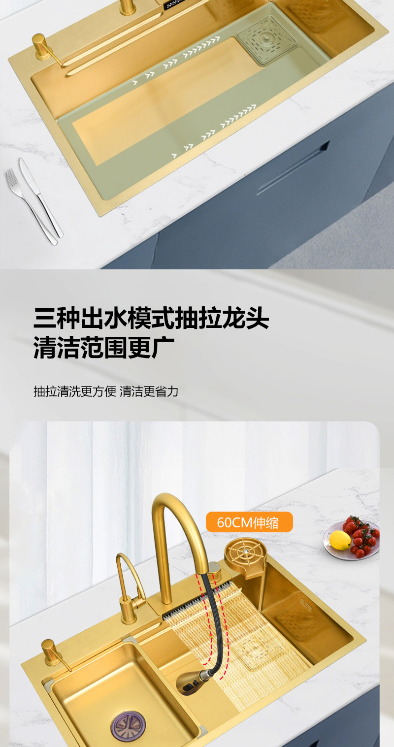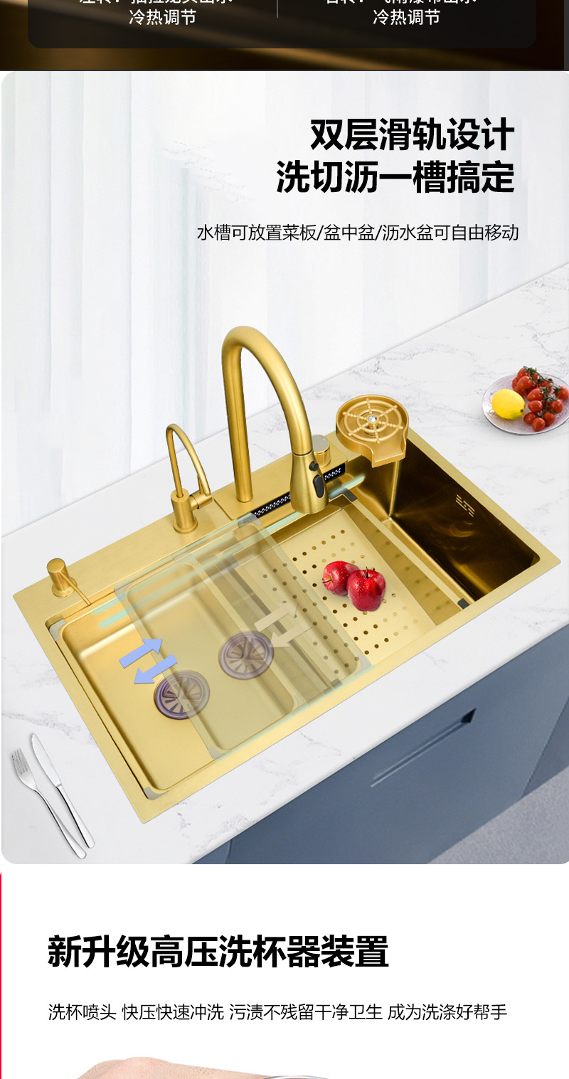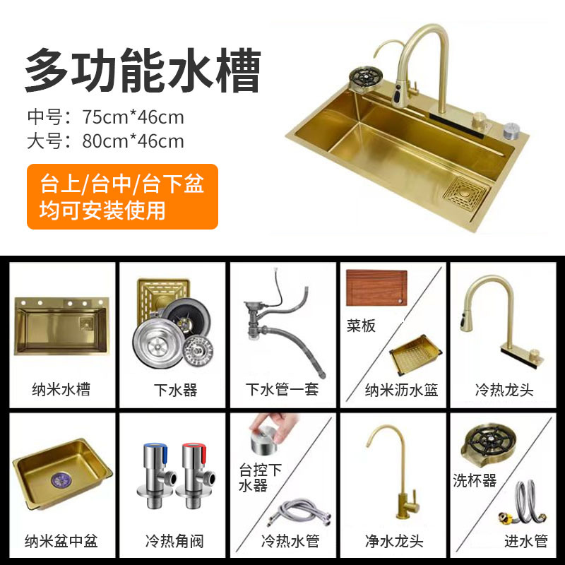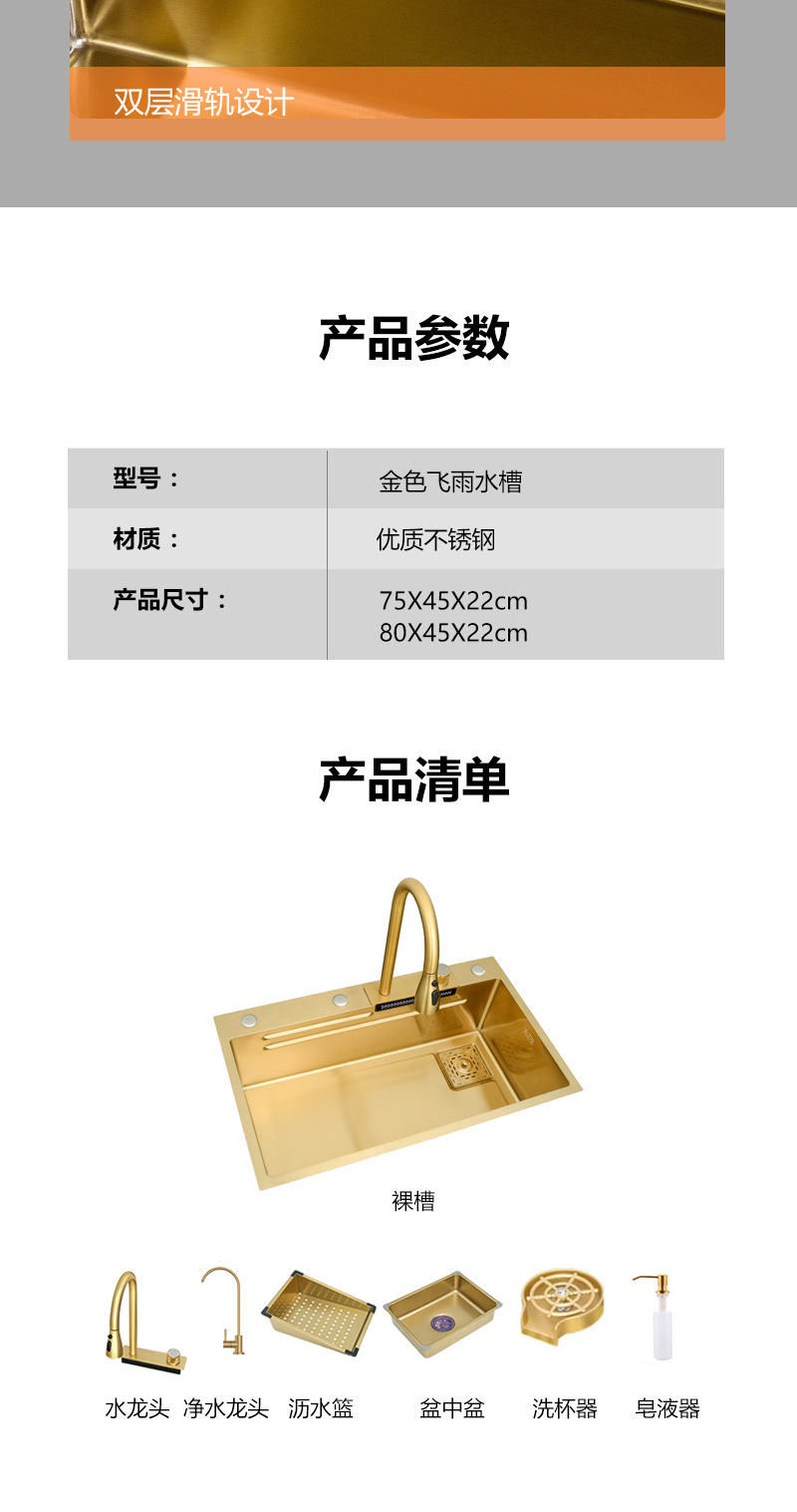 ナノゴールド フライング ウォーターフォール 雨完全構成セット ステンレス鋼 304 キッチン シンク 野菜洗面器 カウンター上部 中下部洗面器