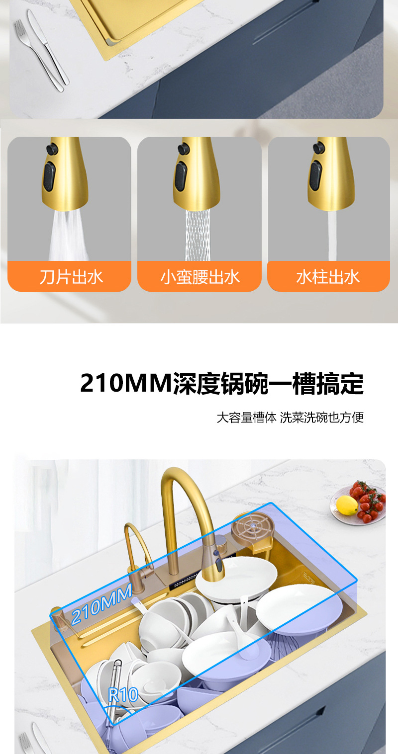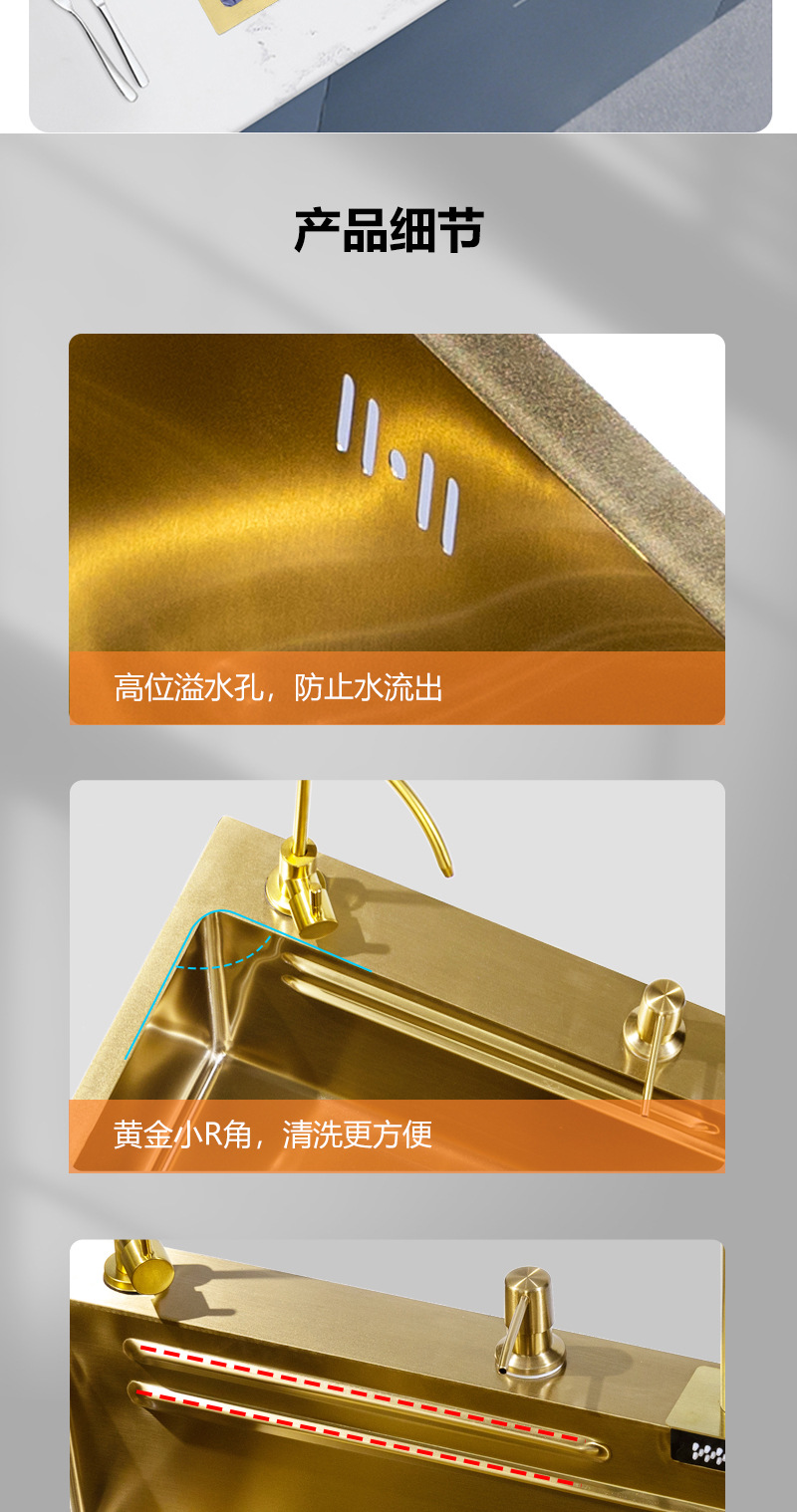 厨房洗菜盆304不锈钢水槽大单槽纳米金色手工洗碗槽岛台水池小号