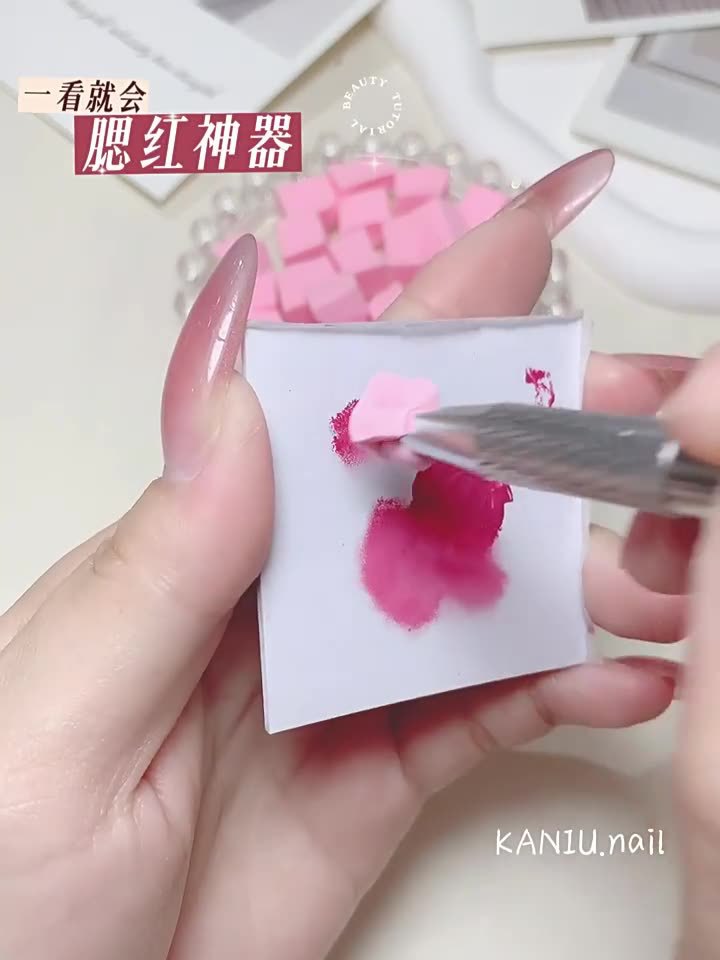 ミニの小さい四角の豆腐の塊のスポンジのグラデーションのネイルアートの専用の道具はぼかして頬紅を染めてゴムのパートナーをたたいて挟みます。