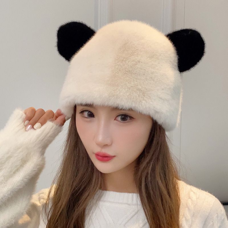 冬用フェイクミンク毛皮のクマ耳付きぬいぐるみ帽子、厚手で暖かく、防風性と耳保護機能付き、冬用厚手で暖かい帽子