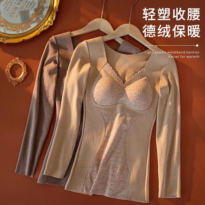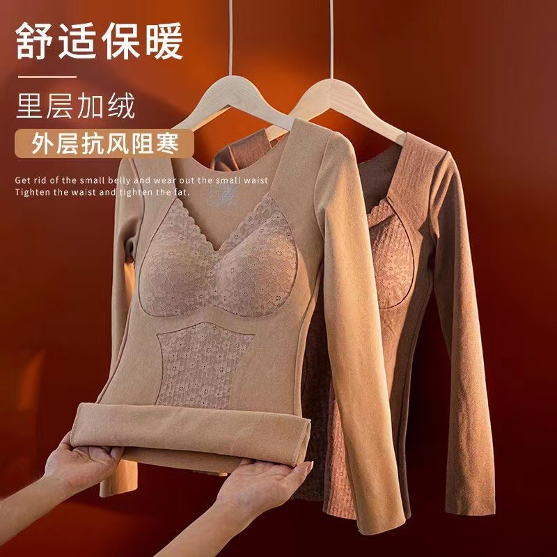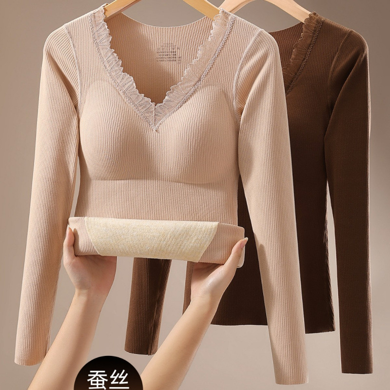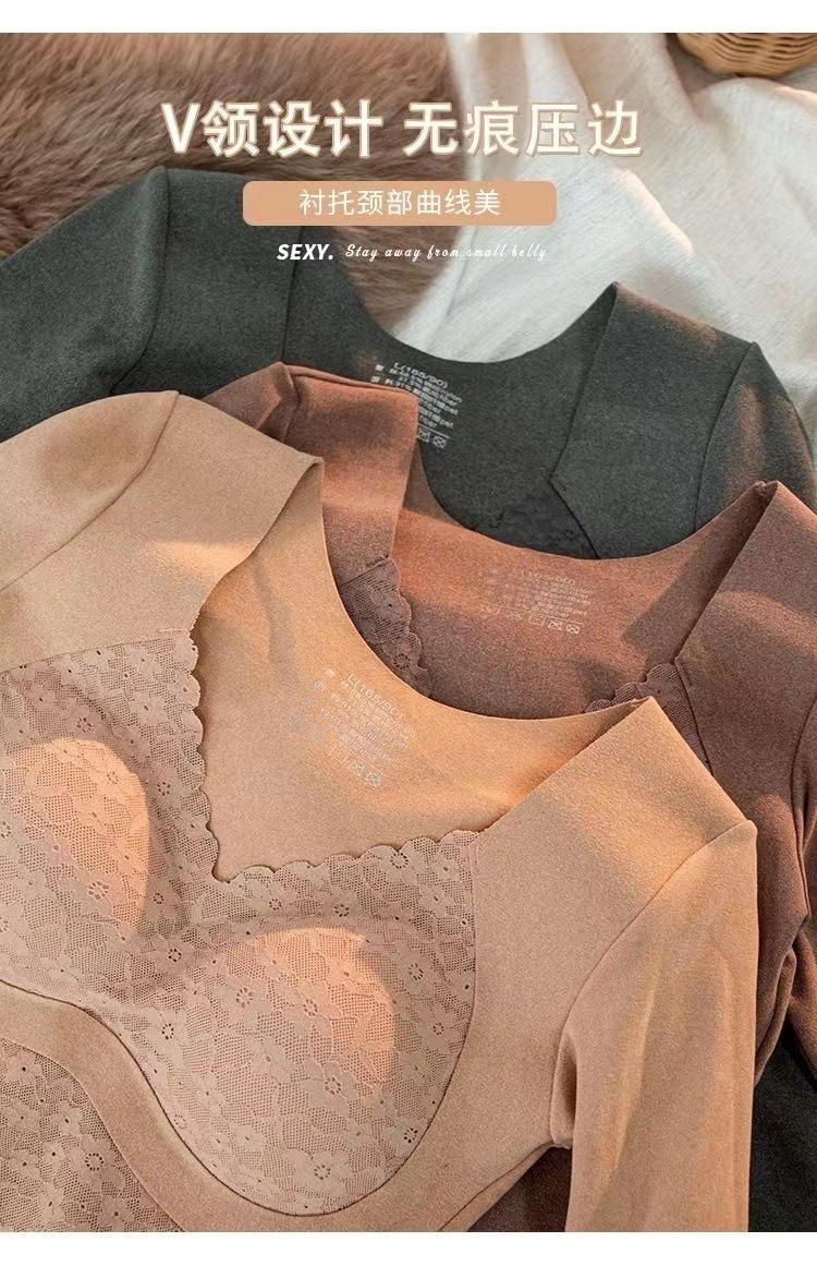 秋冬生放送徳絨毛無痕保温下着上着髪熱帯胸パッドvネック長袖修身厚手秋衣女
