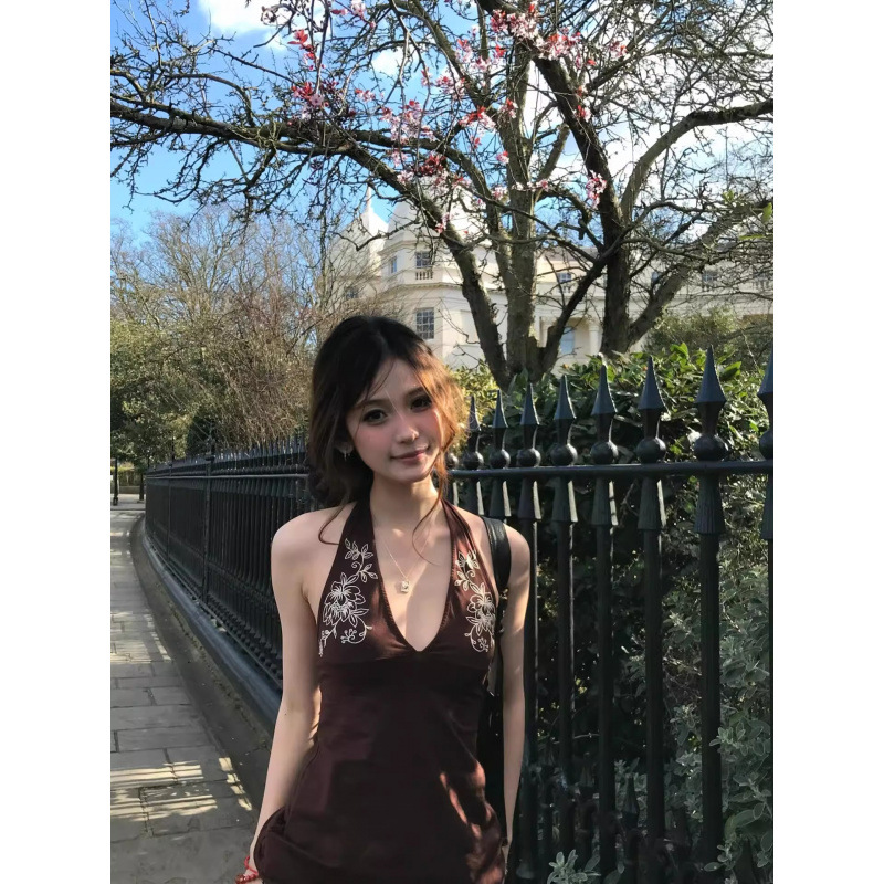 【210g 40番手綿1*1】フレンチレトロフラワープリントホルターネックベストレディース夏着痩せトップス