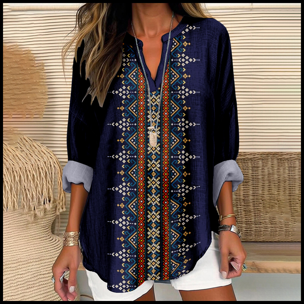 8クロスボーダールーズヨーロッパとアメリカンカジュアルプリント3DレディーススモールVスタンドカラーボタンオフショルダー長袖レディースTスタイル独立ステーション