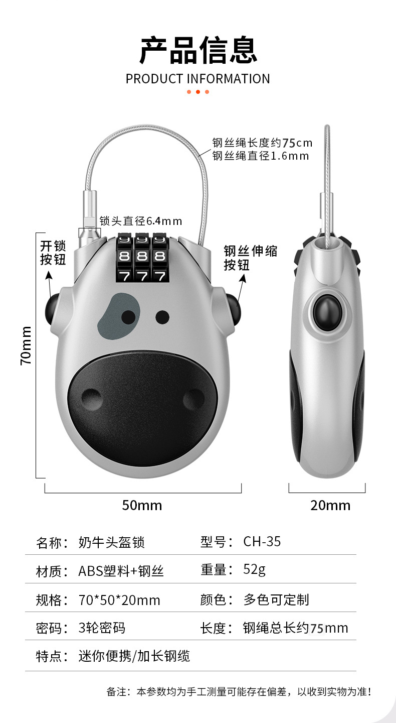 CH-35メーカー生産旅行ABS3ビットコード伸縮可能なワイヤーロープ登山バッグロックヘルメットロック乳牛ロック