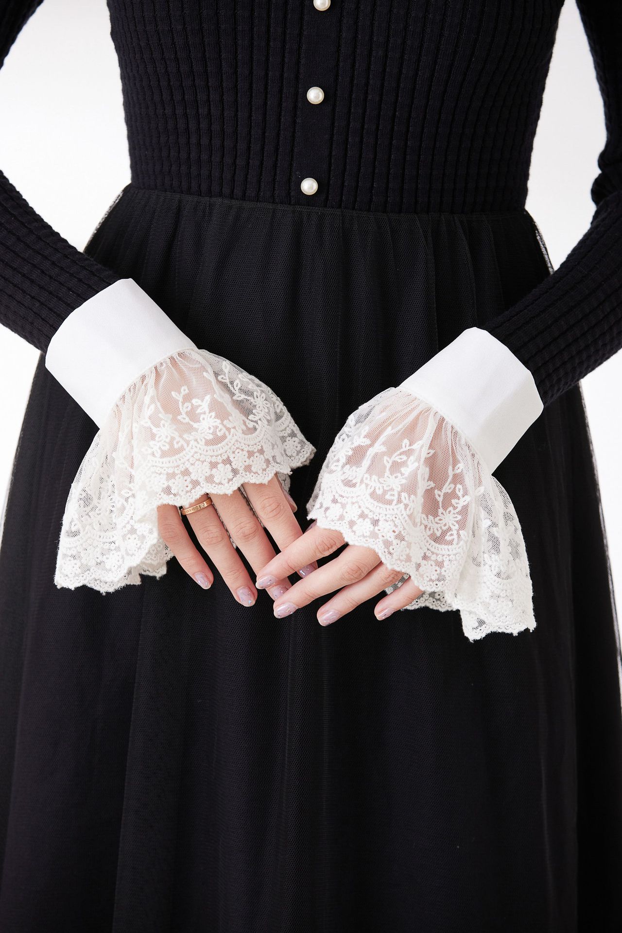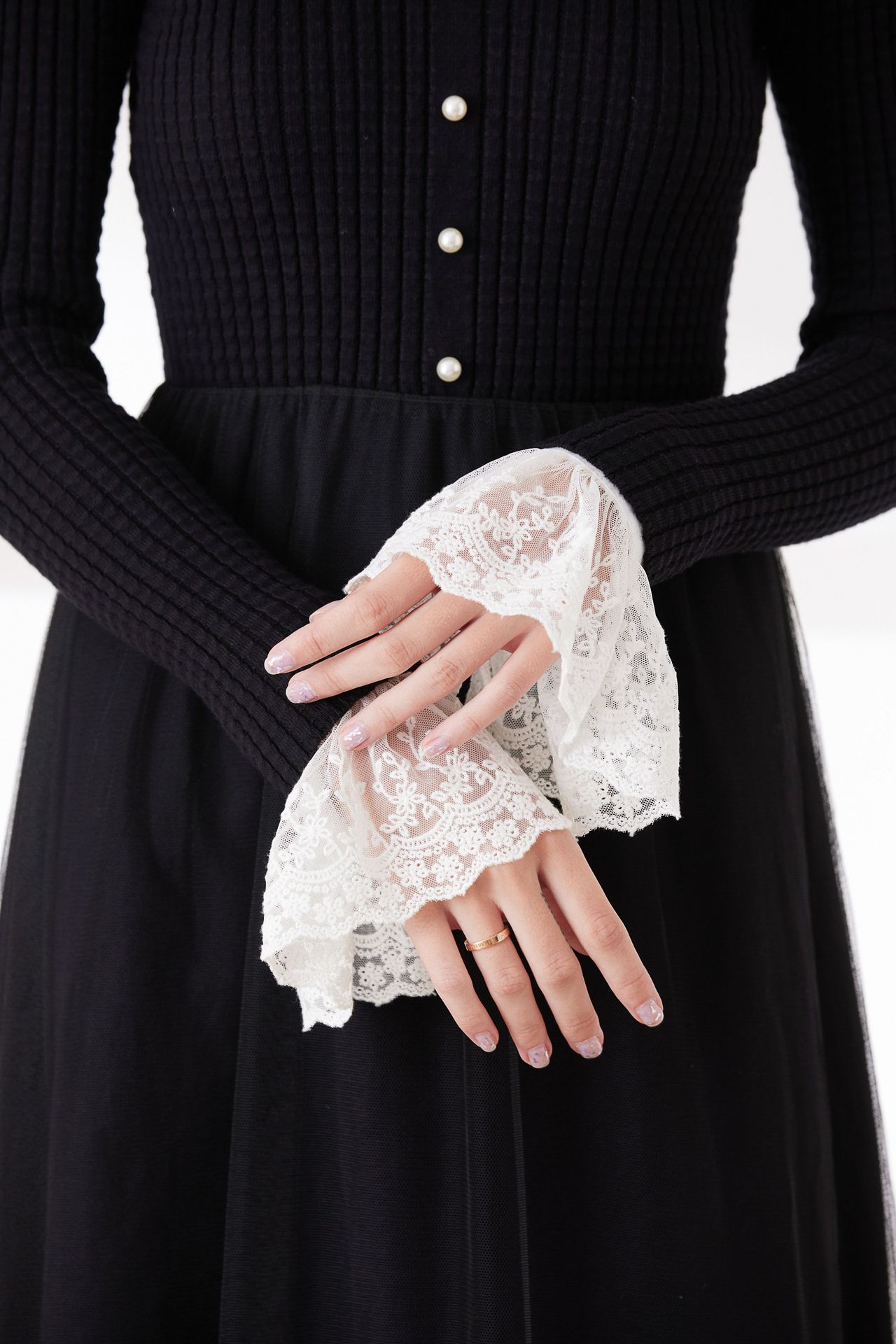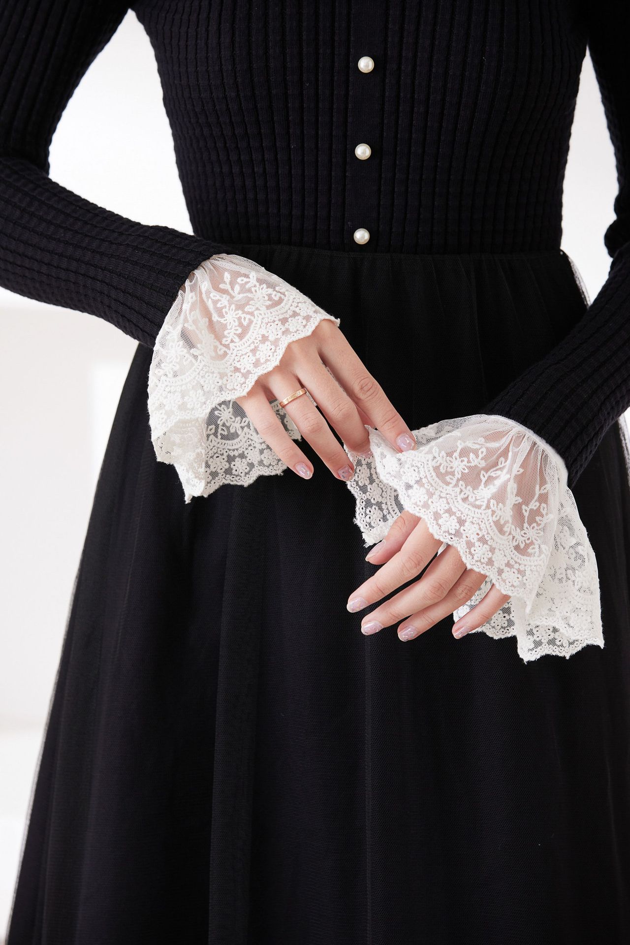 韓国の春と秋の冬の休暇の袖カバーの美しいレースの二重のシフォンのアクセサリの黒い白い袖口の百合のセーターの文芸01