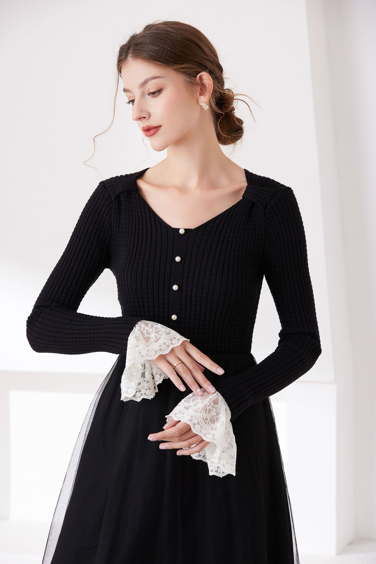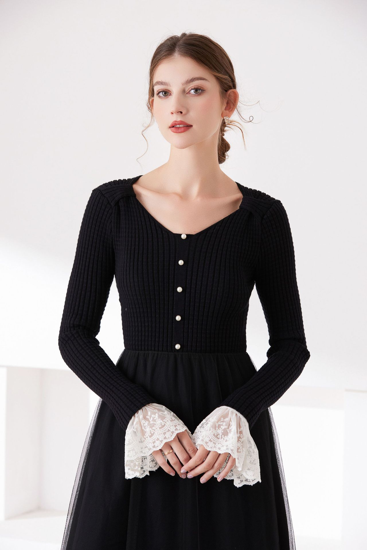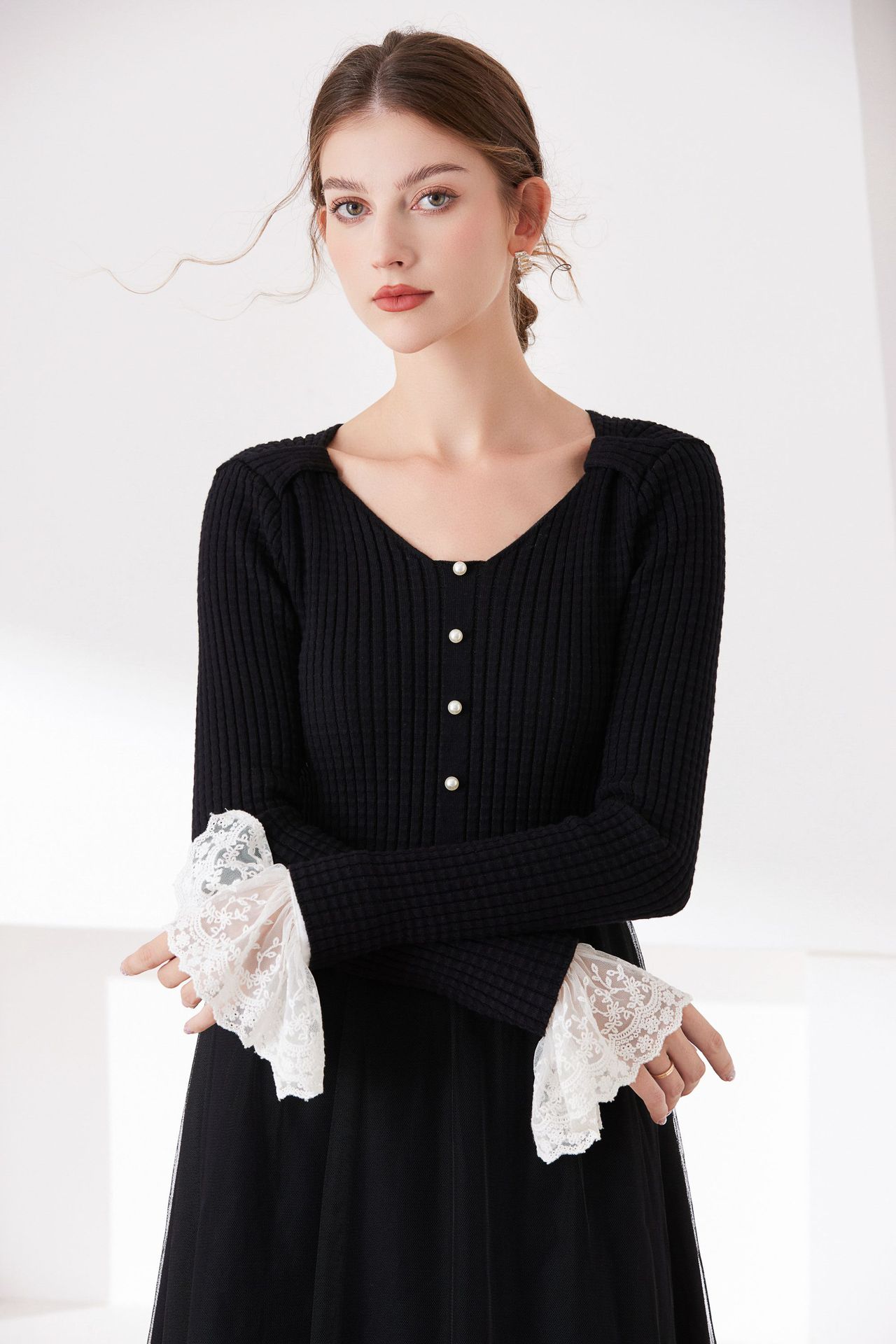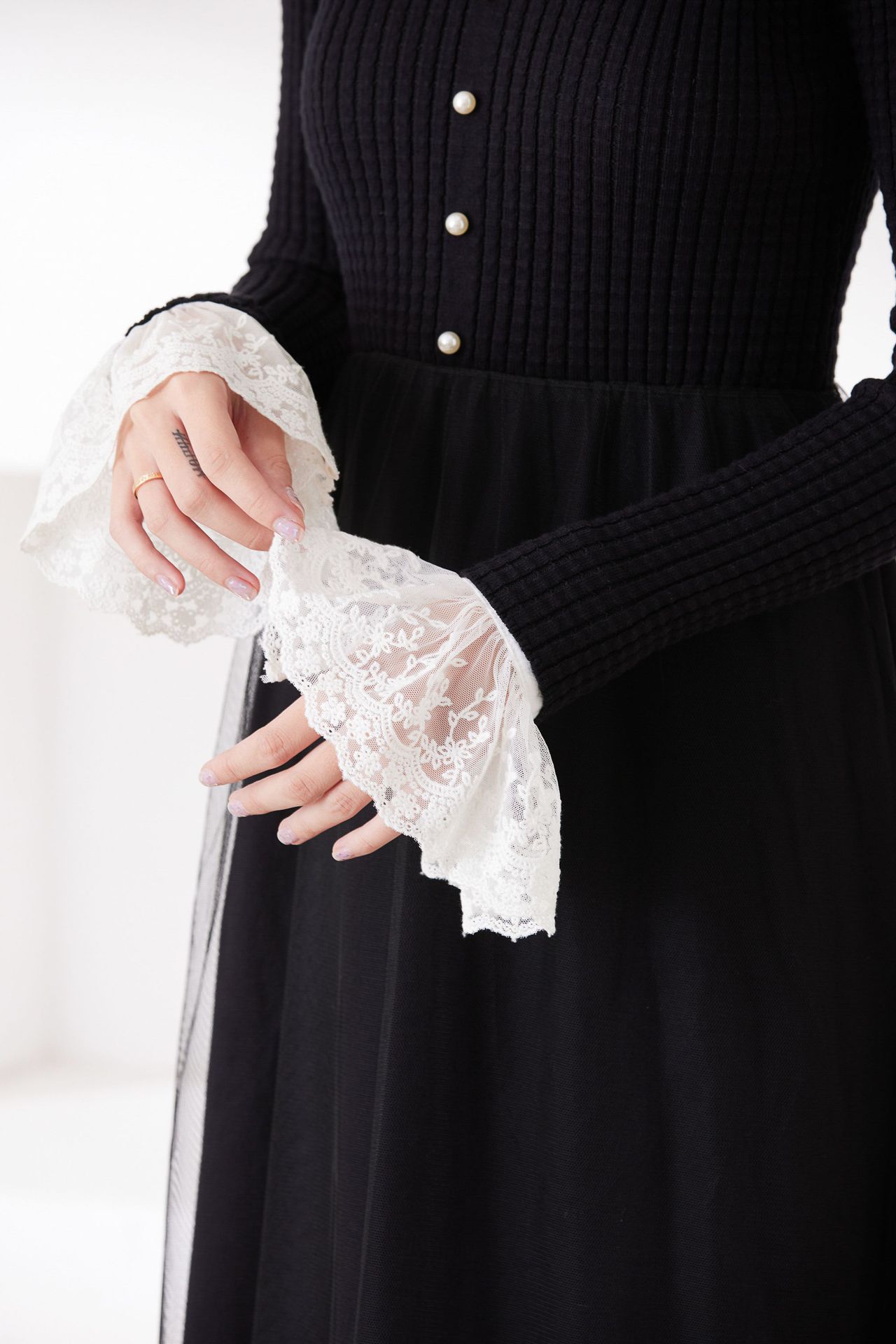 韓国の春と秋の冬の休暇の袖カバーの美しいレースの二重のシフォンのアクセサリの黒い白い袖口の百合のセーターの文芸01