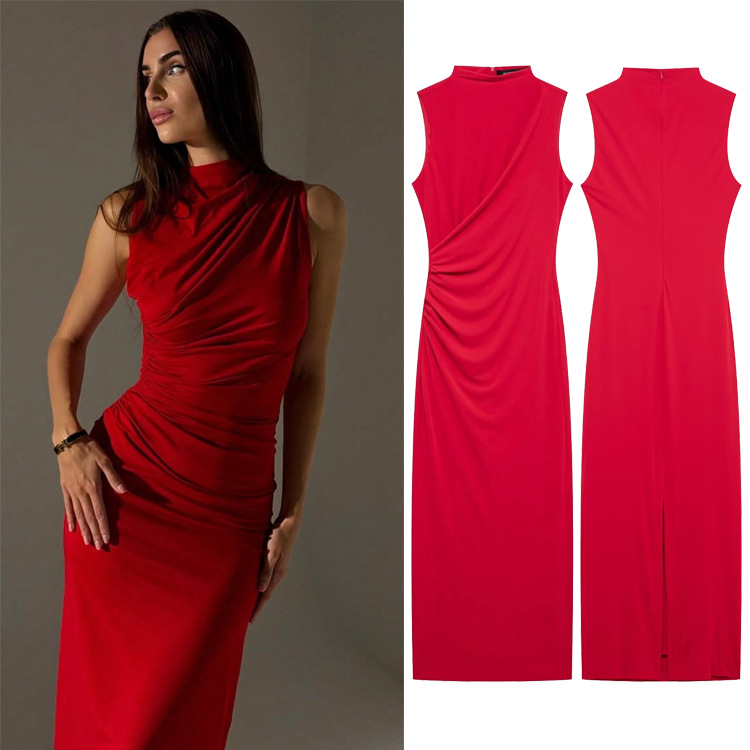 クロスボーダーレディースファッション卸売ヨーロッパとアメリカンスタイルのノースリーブプリーツスリムロングスリットドレス