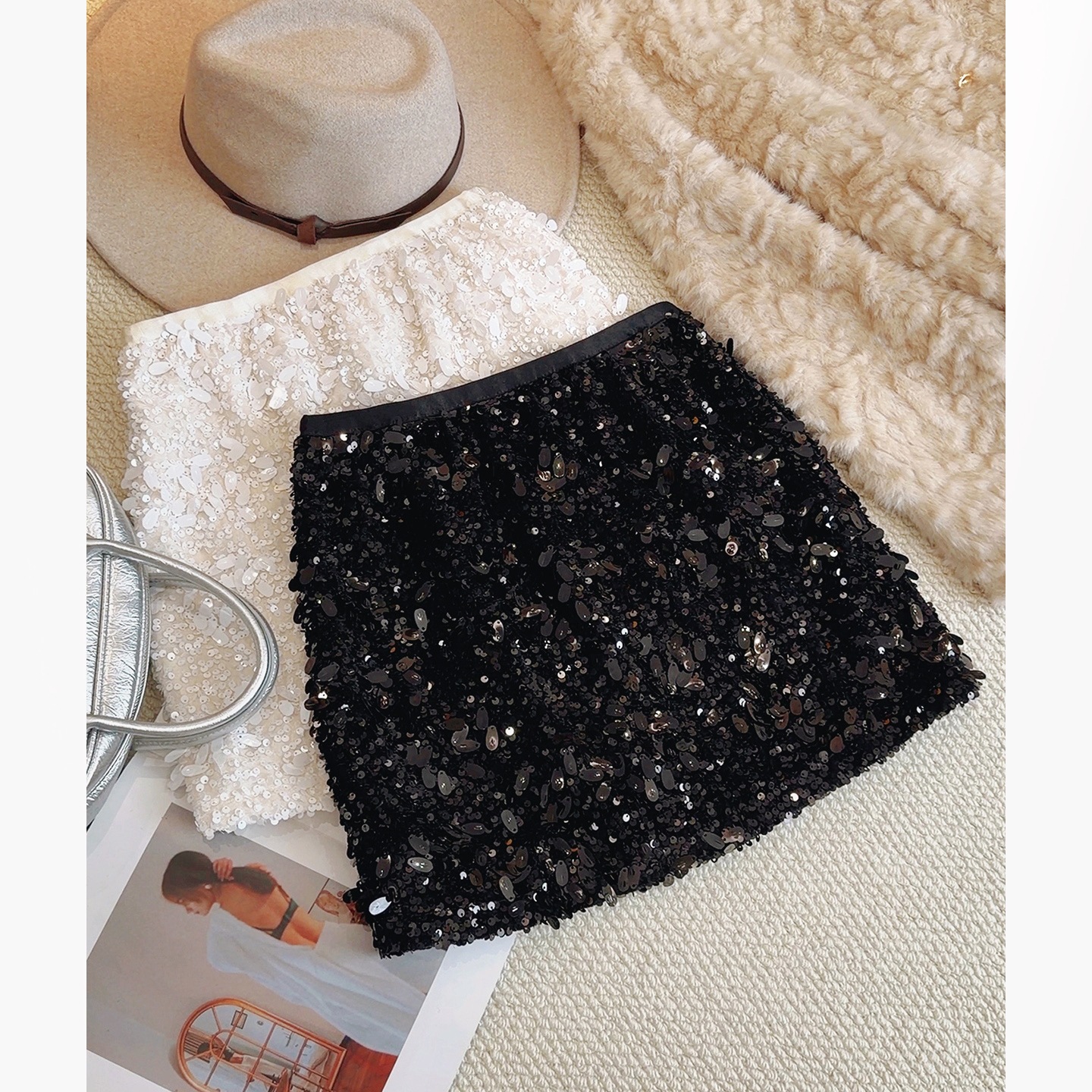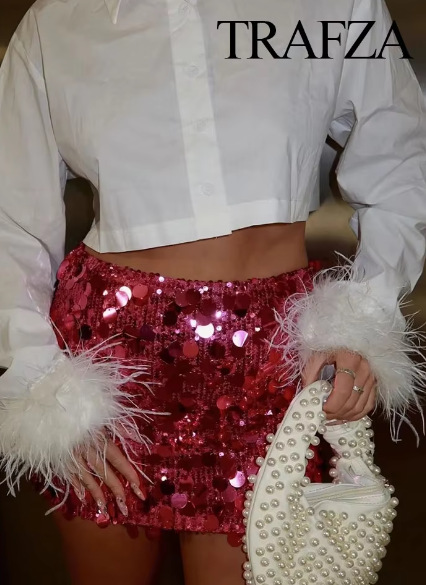 2025年欧米新作、海外貿易向け、スパンコールが輝くファッショナブルで上品なタイトフィットの超ミニ丈スカート、ヒップを包み込むシルエットでスリムに見せます。