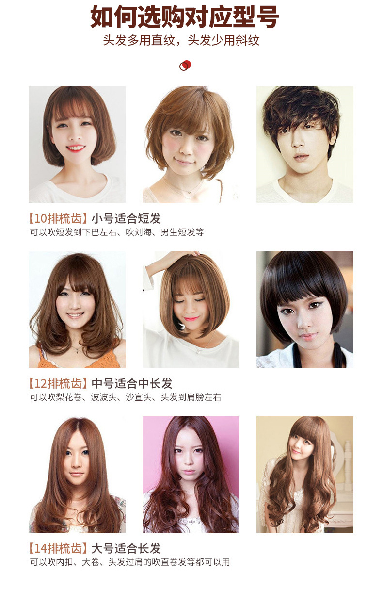 細かいストレートパターン(ショートヘア/ブローストレートヘア/前髪に適しています),小さなツイル (ショートヘア/ブローカール/ボボヘッドに適しています),ミディアムストレートパターン(ミディアムヘア/ブローストレートヘア/インナーバックルに適しています),ミディアムツイル(ミディアムヘア/ブローカール/ペアカールに適しています),大きめストレートパターン(ロングヘア・ブロードライヘア・ふんわりヘアに最適),大きめのツイル(ロングヘア/ブローカール/ビッグウェーブに最適)