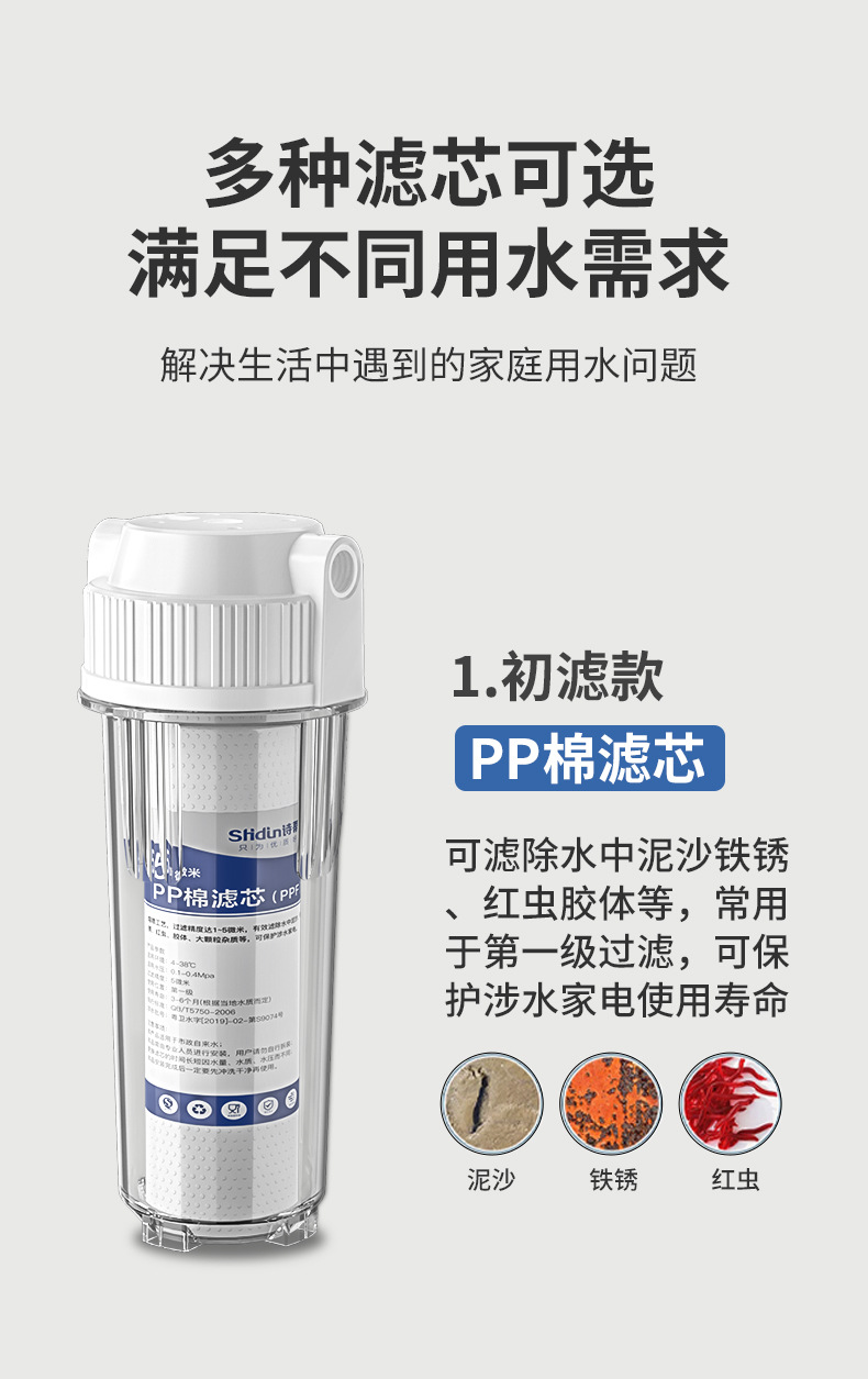 効能 水中の沈殿物、錆、粒子状不純物、異常な色や臭いなどをろ過し、さまざまな組み合わせが可能です。