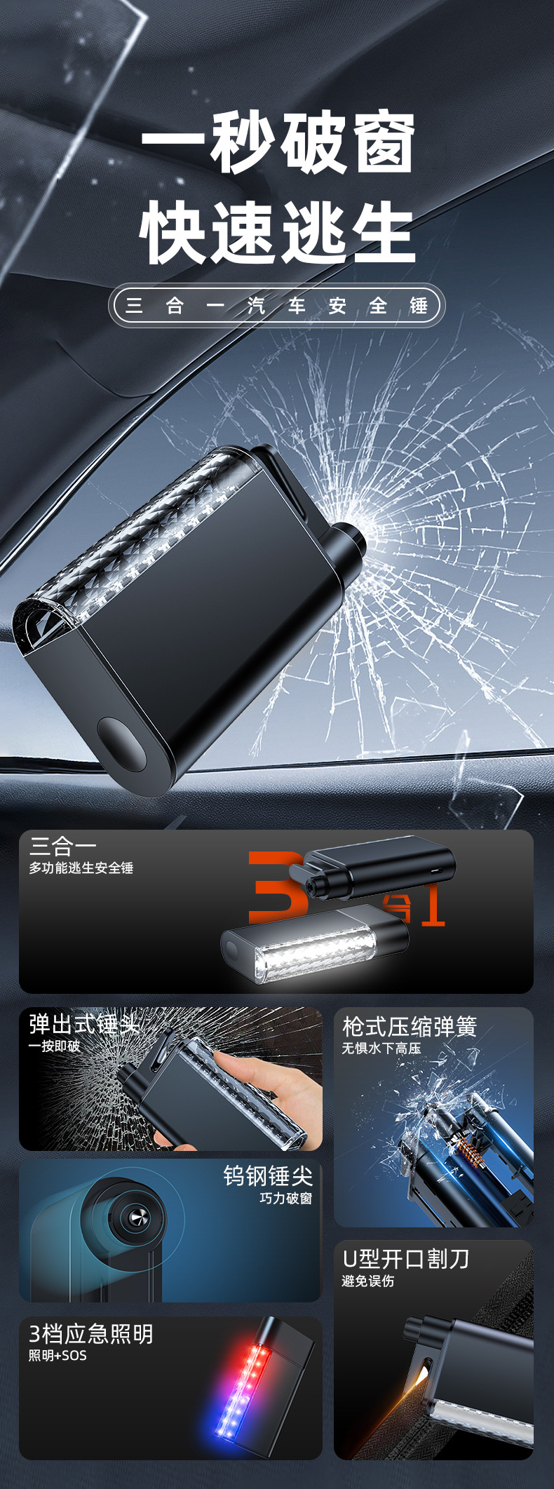 車載安全ハンマー懐中電灯窓を壊す多機能緊急三合一自動車脱出ハンマーランプ付き窓を壊す神器