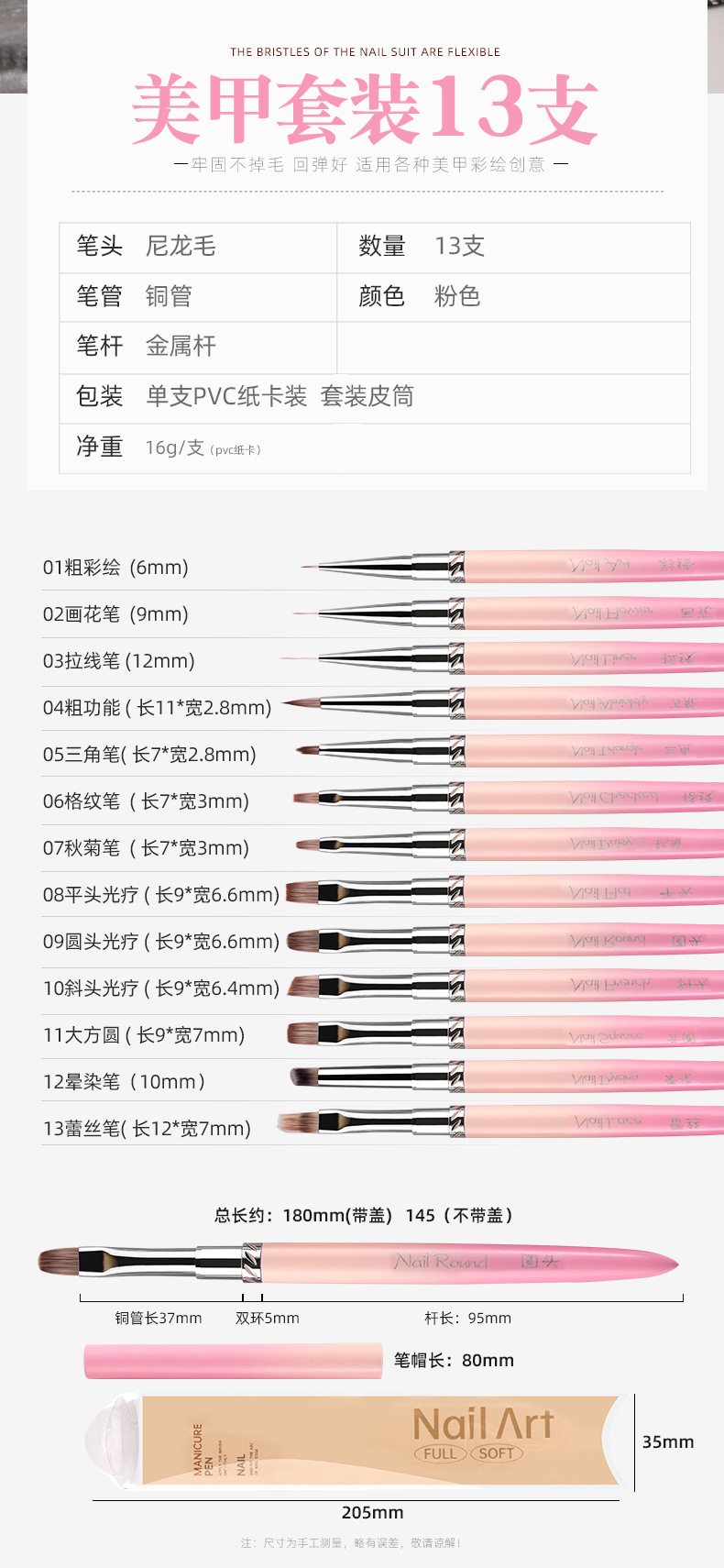 01 粗塗装--(6mm),02 フラワーペイントペン--(9mm),03 ラインペン-(12mm),04 太めの機能ペン,05 三角ペン,06 チェックペン,07 Qiuju ペン,08 フラットヘッド光線療法ペン,09 丸頭光線療法ペン,10 斜めヘッド光線療法ペン,11 個の大きな円,スマッジペン12本,13 レースペン,13本セットにはピンクのレザーチューブが付属します