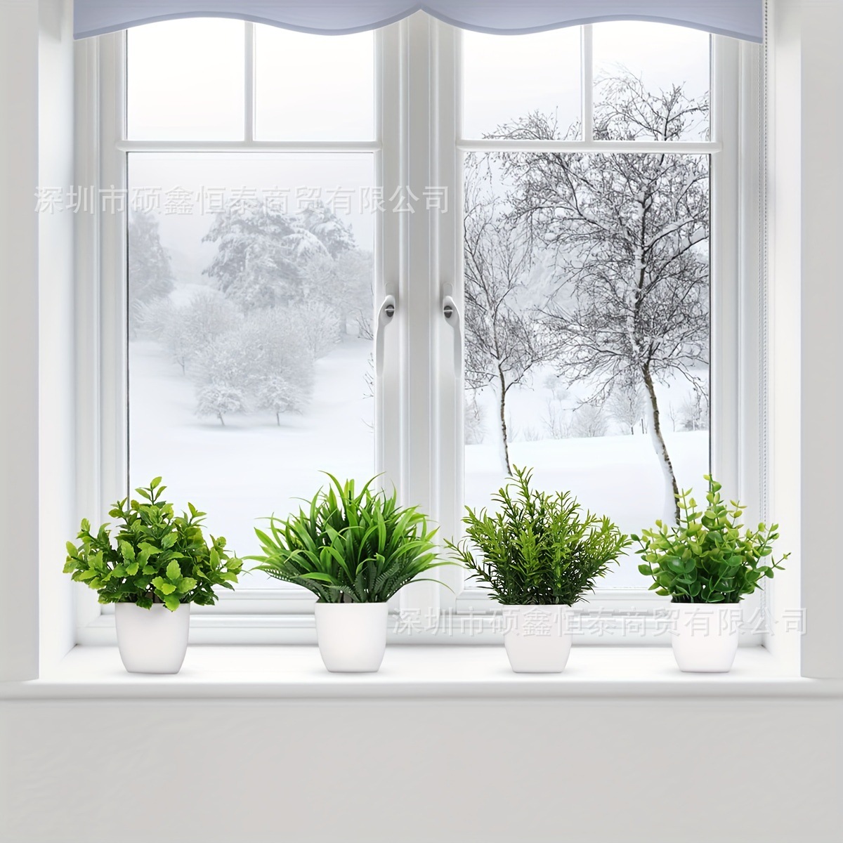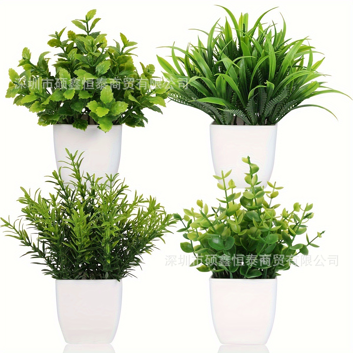 国境を越えて起爆した4つの小さな鉢植えの組み合わせは、緑の花の偽植物の室内外の家庭装飾をシミュレートしている