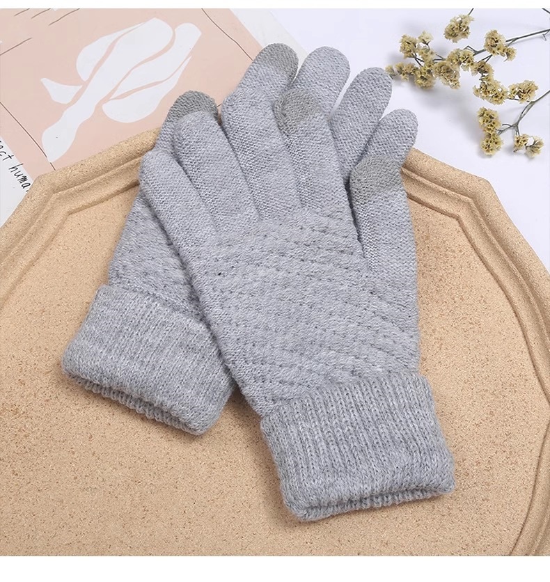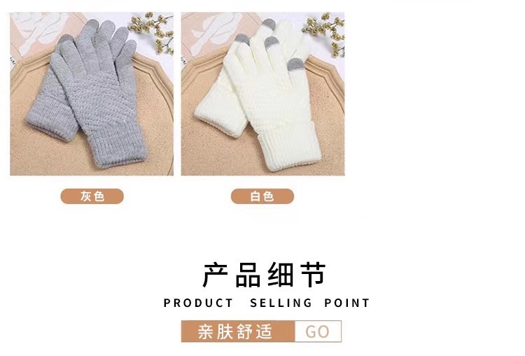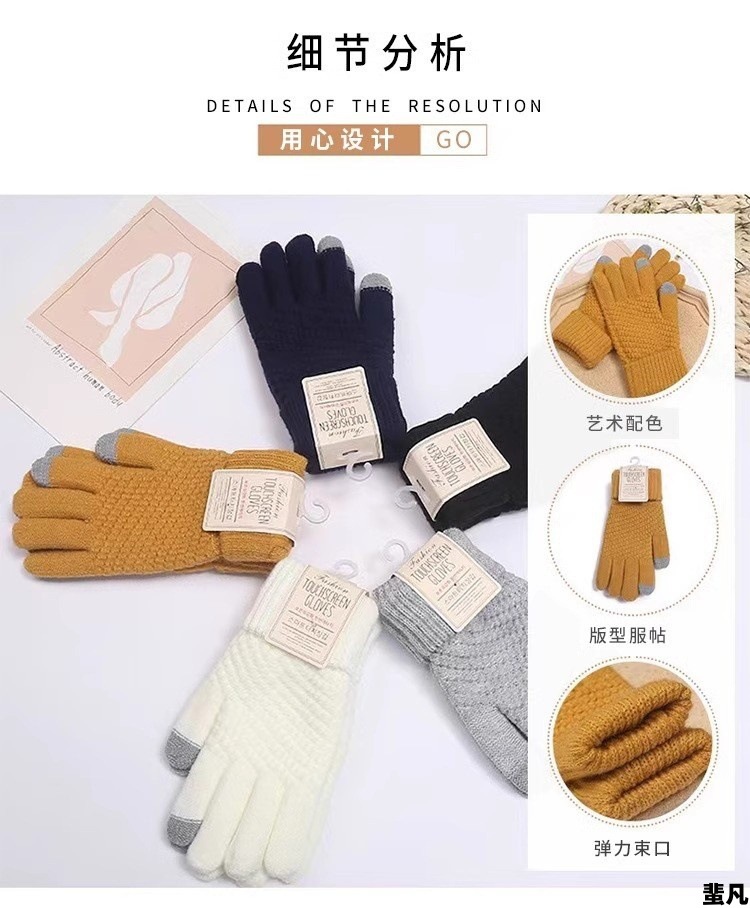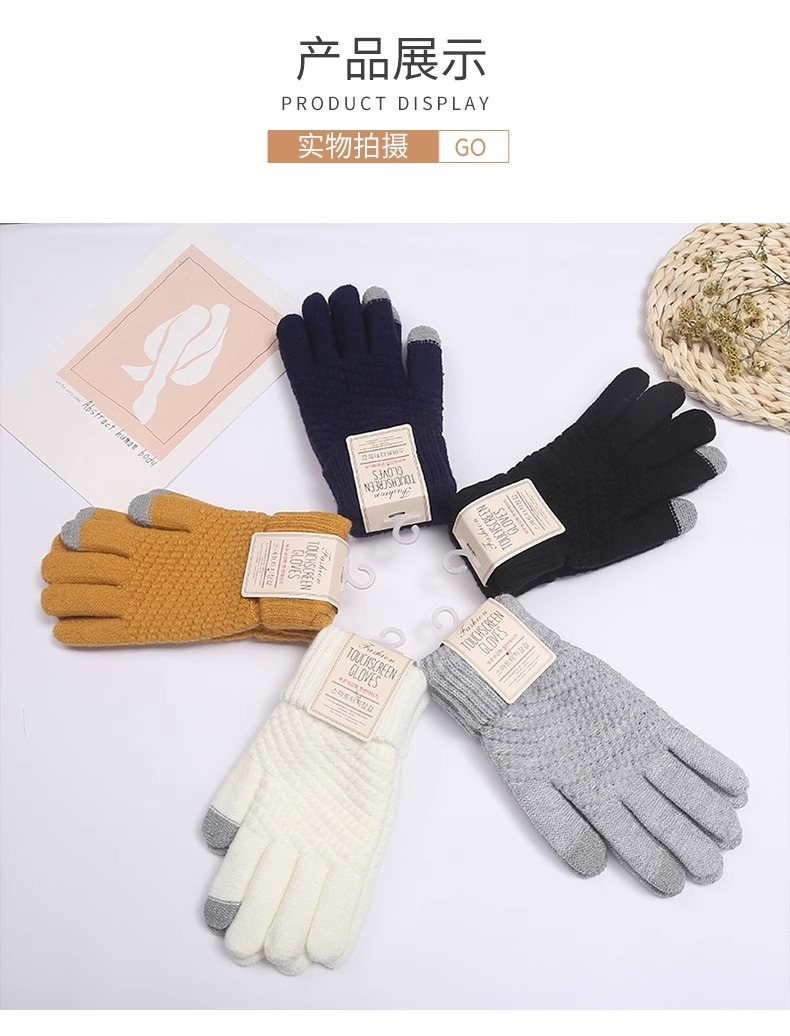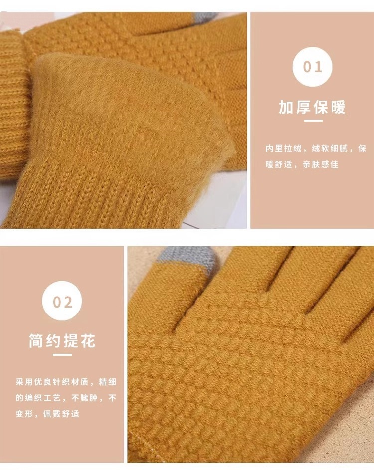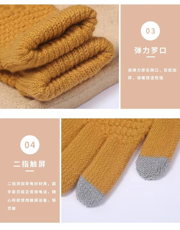 厂家批发菠萝纹触屏手套冬季加绒加厚防风防寒针织毛线分指手套