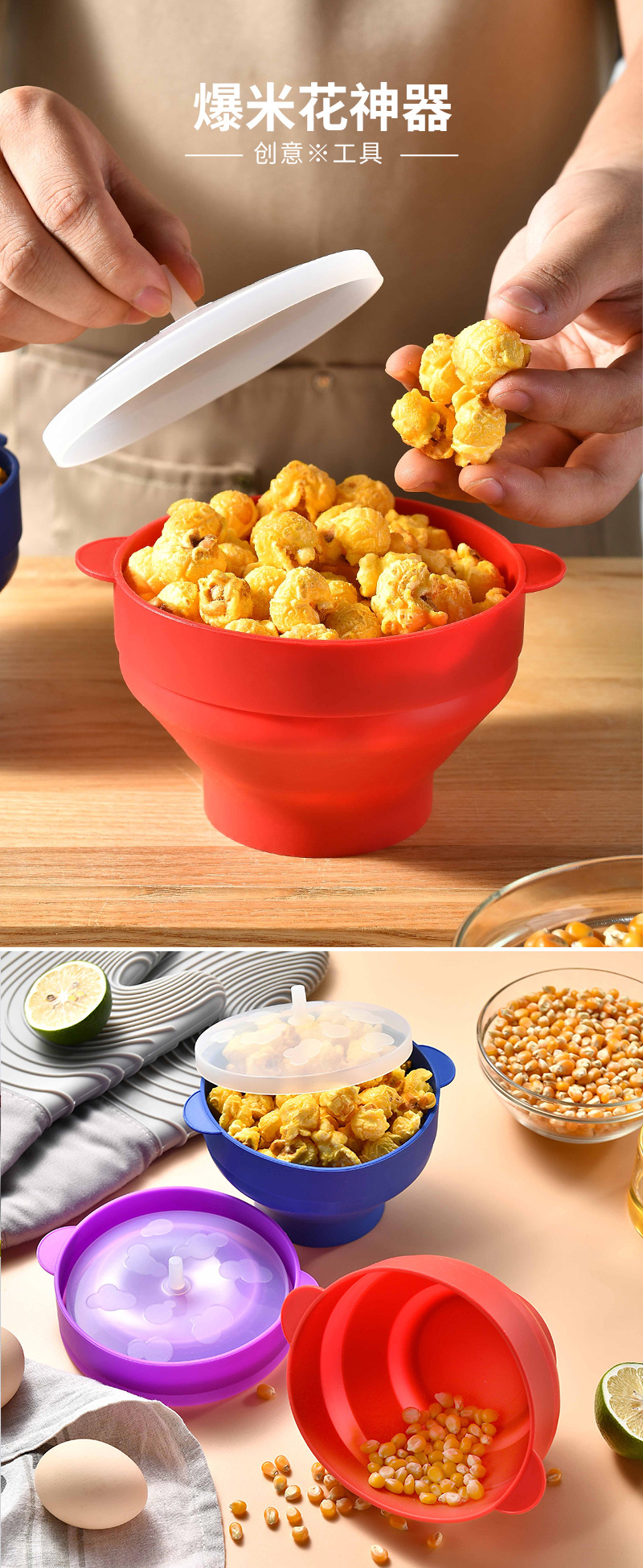 工場直販 電子レンジ用ポップコーンメーカー シリコン製小型ポップコーンボウル 蓋付き 折りたたみ式 輸出向け人気商品