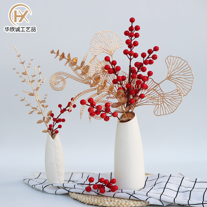 金色の造花、新年飾り、福桶飾り、年越し花、金箔のフラワーアレンジメント、赤い果実、春節の赤い果実、クリスマス