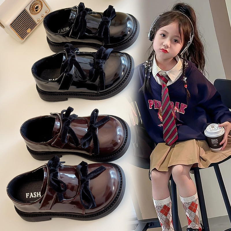 2025春の女の子の王女の靴2024秋冬の新型の子供の靴の黒色は女性の宝の靴の楽福の靴を演出します。