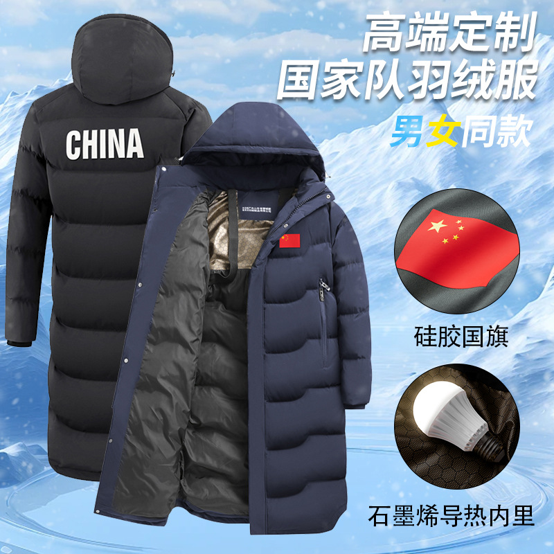 高級白鴨絨毛長型コート国家チーム運動ダウンジャケット男女長型体育生試合訓練服冬