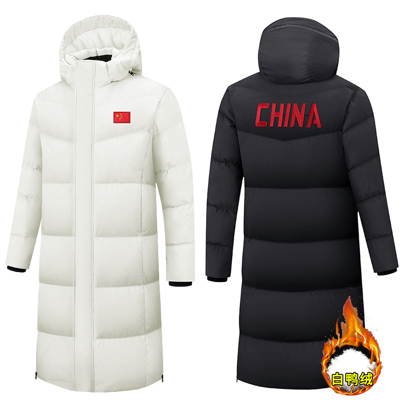 中国队运动加绒白鸭绒过膝训练冬季白鸭绒男足球篮球羽绒服大衣