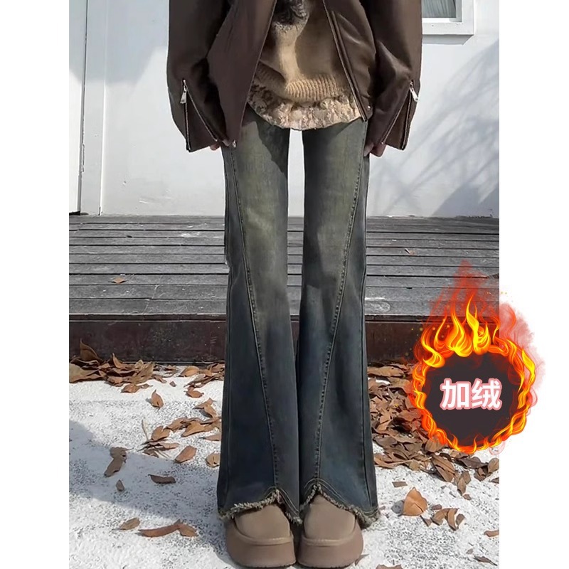 マイクロフレアハイウエストデニムパンツ レディース 裏起毛 小柄さん向け 梨型体型 レトロ ゆったり 着痩せ効果 多用途 ストレート ワイドパンツ