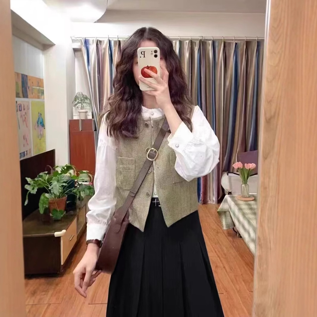 2025年秋茶系コーデ、小香風ベストとシャツの重ね着、韓国風コーデ、カレッジ風年齢軽減セット