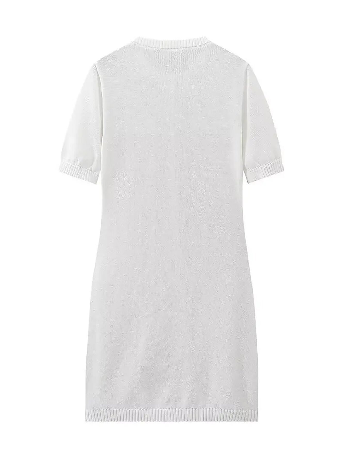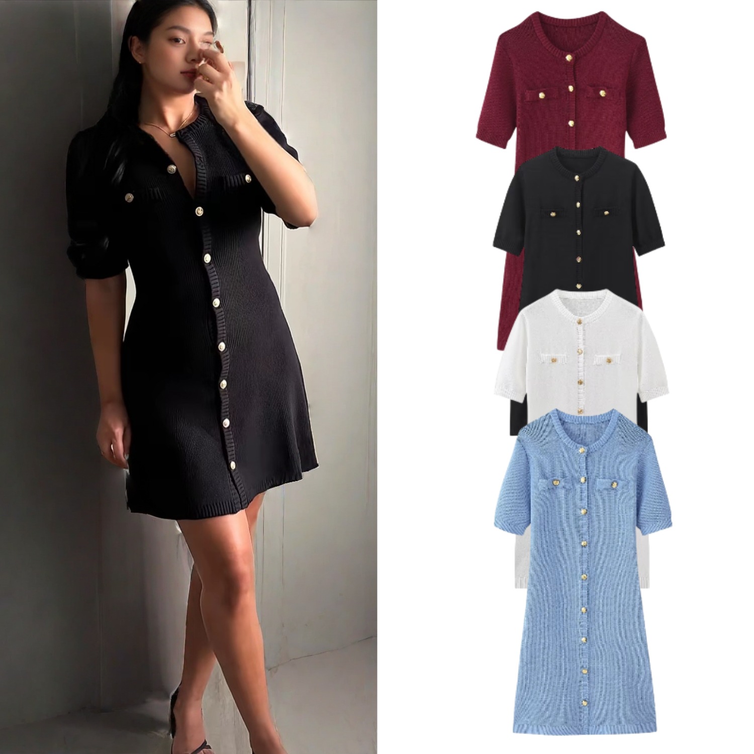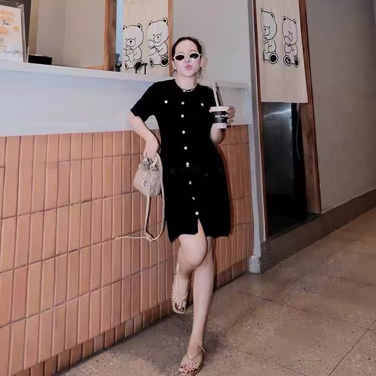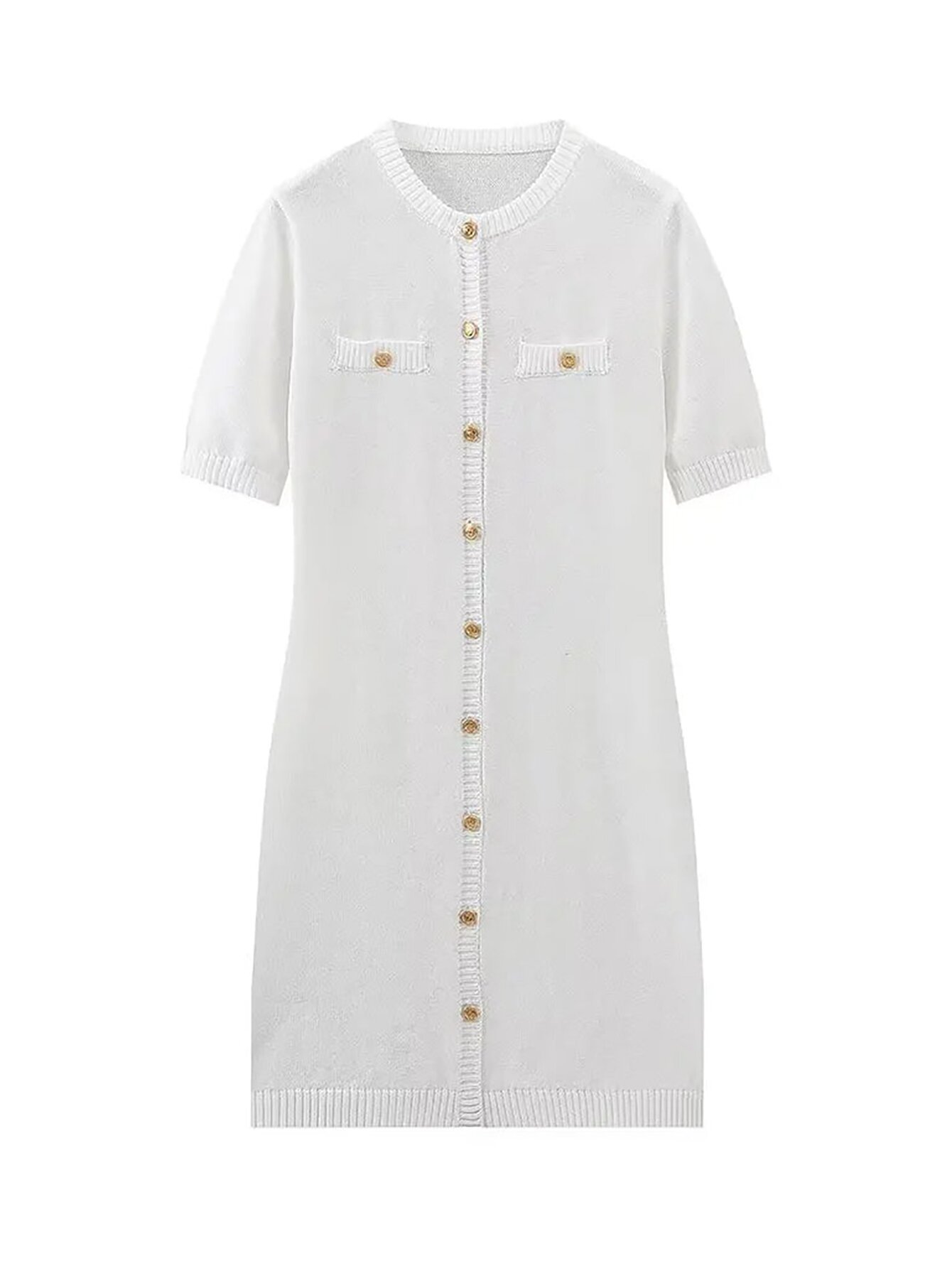 欧米風2025春新作女装レトロ丸首半袖スリムヒップボタン飾りニットワンピース