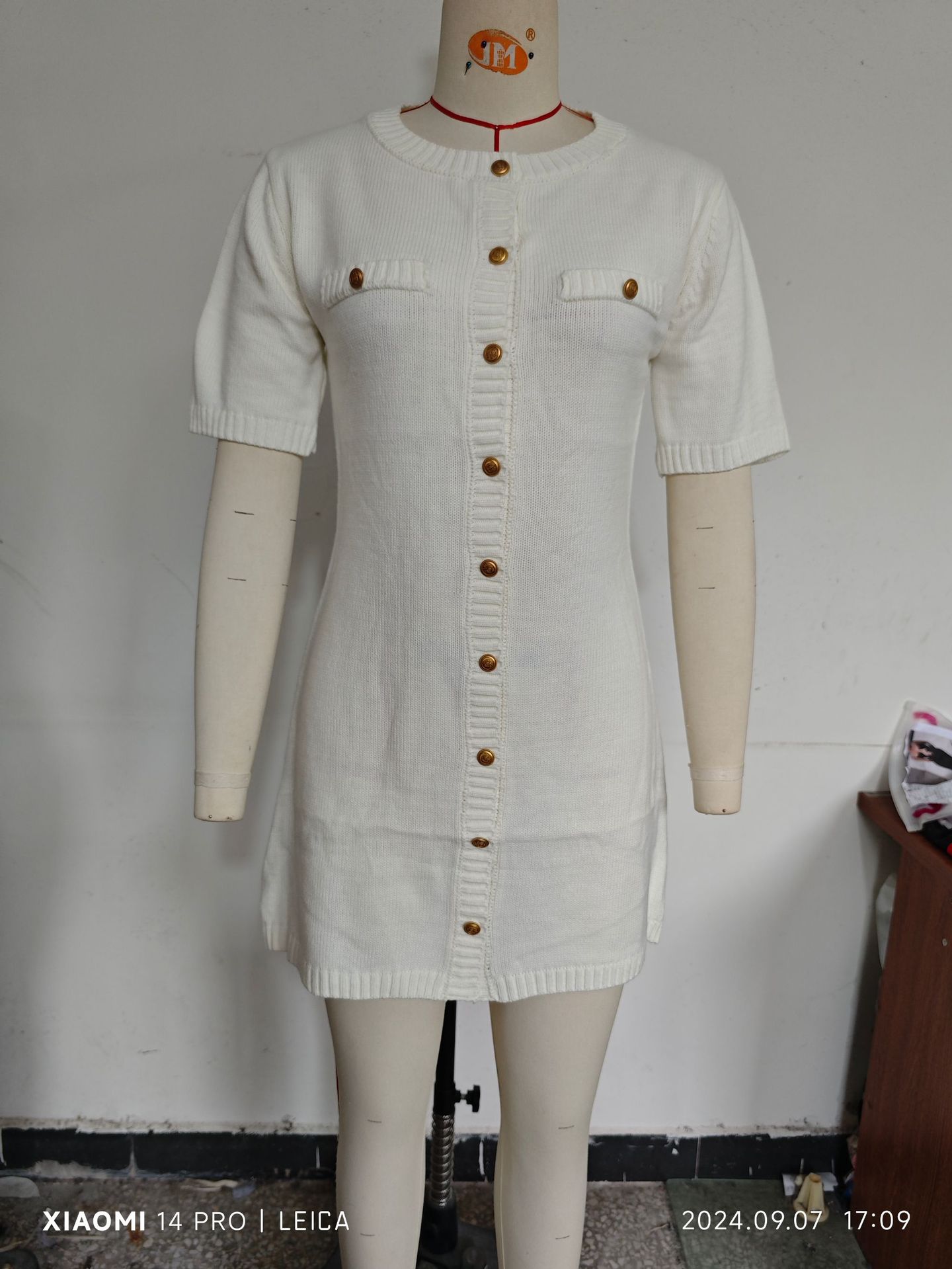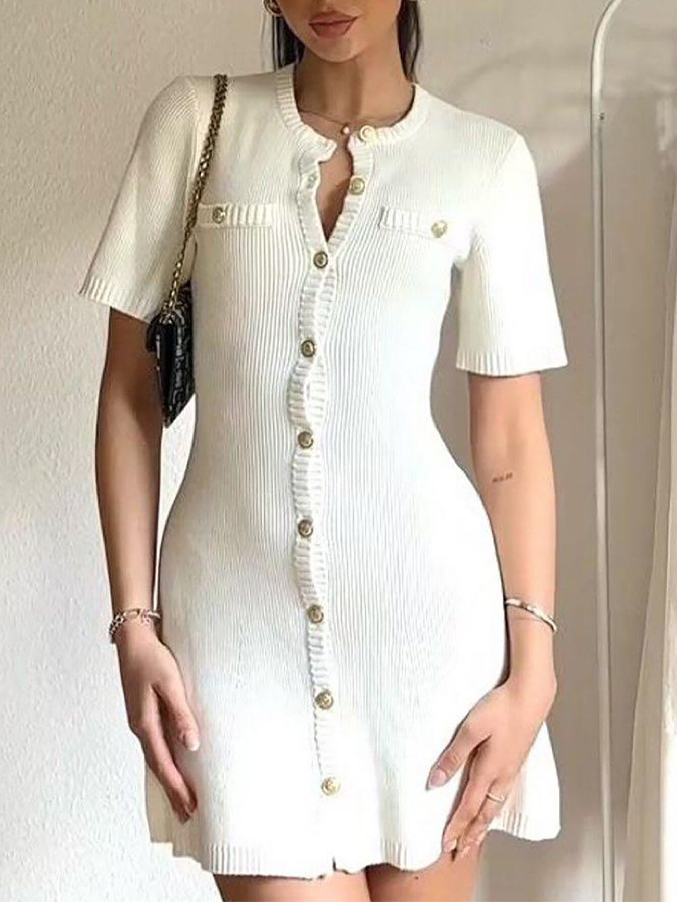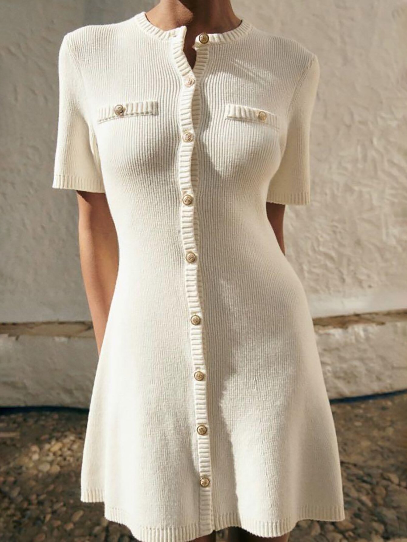 欧米風2025春新作女装レトロ丸首半袖スリムヒップボタン飾りニットワンピース