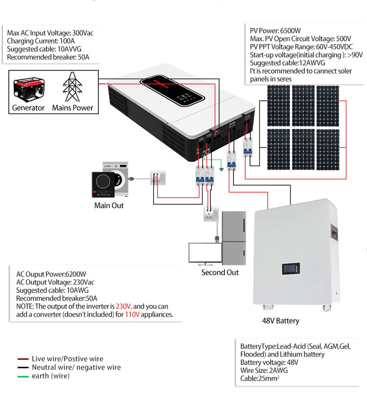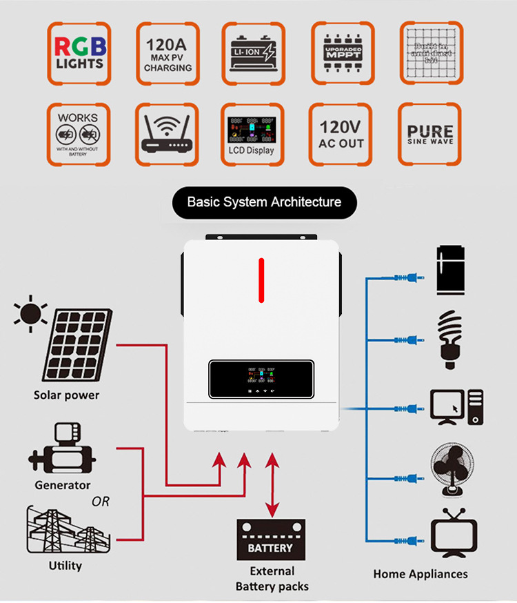 6.2KW オフグリッドおよびグリッドハイブリッド逆制御統合 120A 充電 MPPT/BMS ソーラー純粋な正弦波インバーター