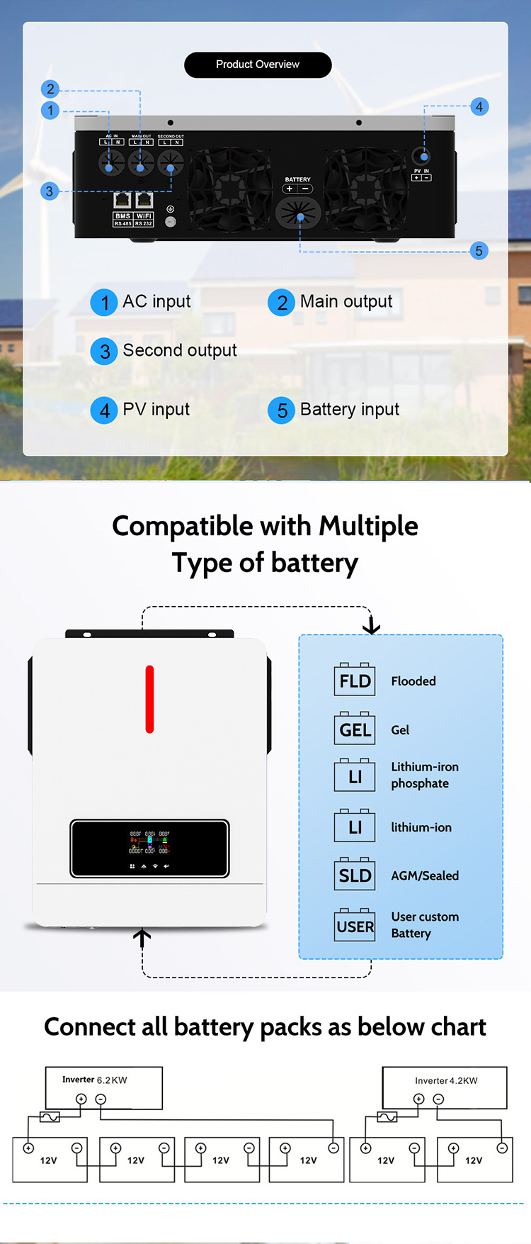 3.6KW4.2KW6.2KW混合太阳能逆变器 离并网储能逆变器双路AC输出