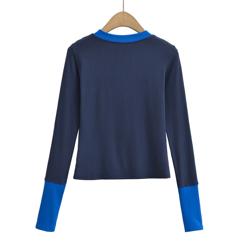 撞色假两件纽扣开领打底衫t恤秋季长袖内搭修身辣妹拼接休闲上衣