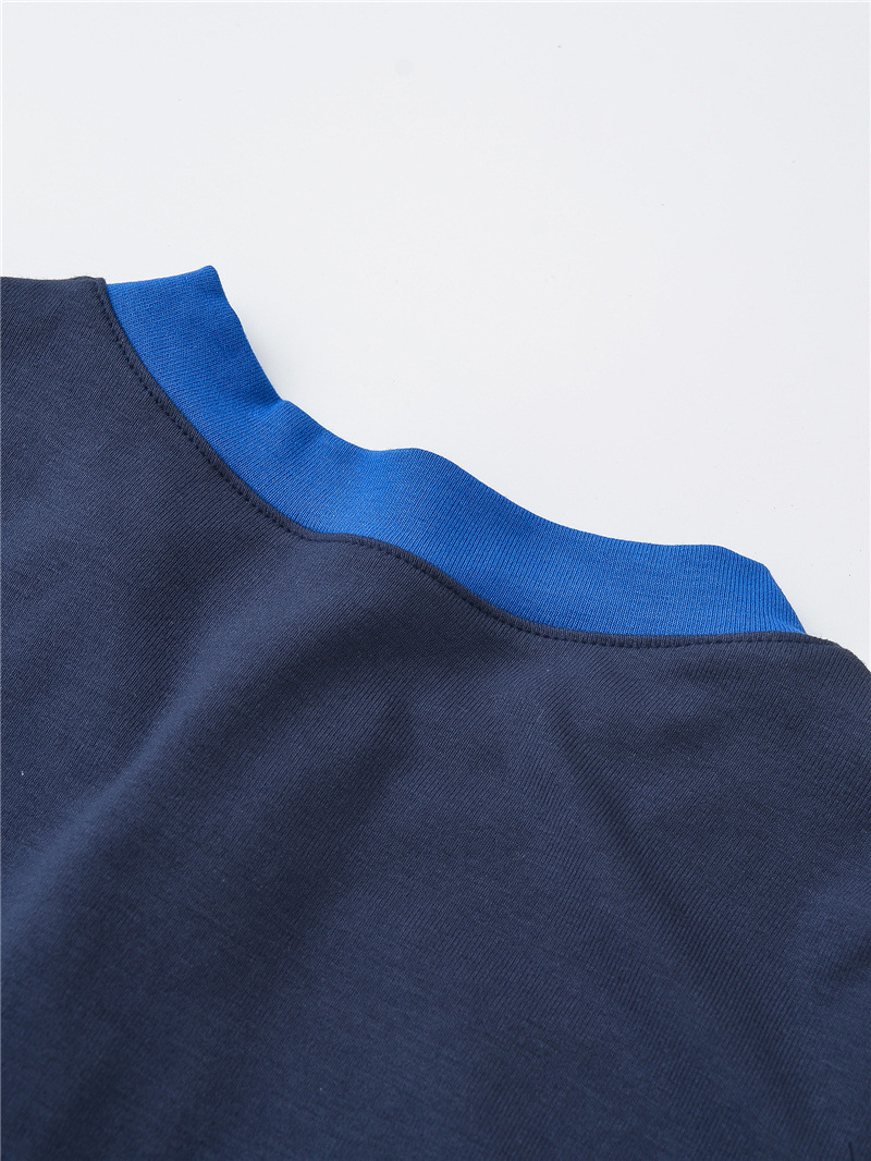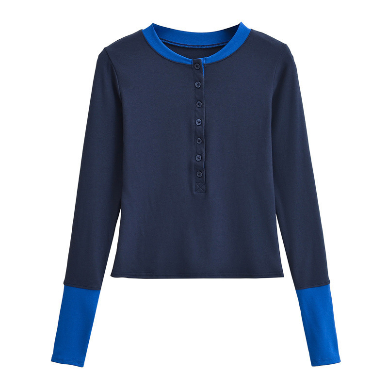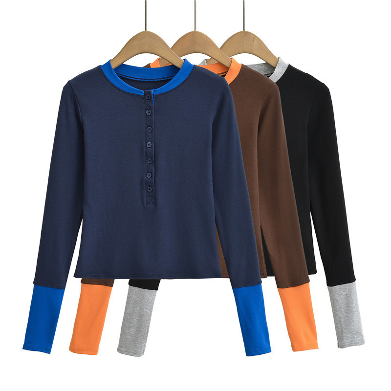 2024秋の欧米風の衝突色は丸首の単列のボタンの頭の超長袖のtシャツの女性の底のシャツの上着をつなぎ合わせます。