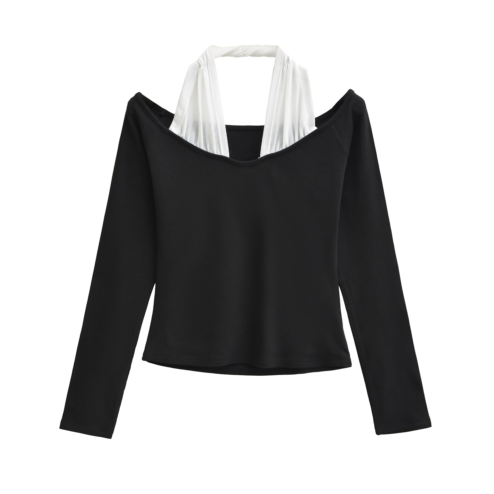 辣妹风假两件撞色拼接一字肩挂脖长袖T恤女秋冬季纯欲打底衫上衣