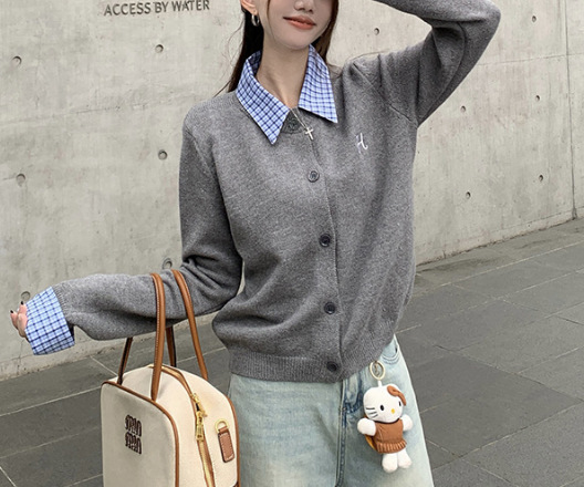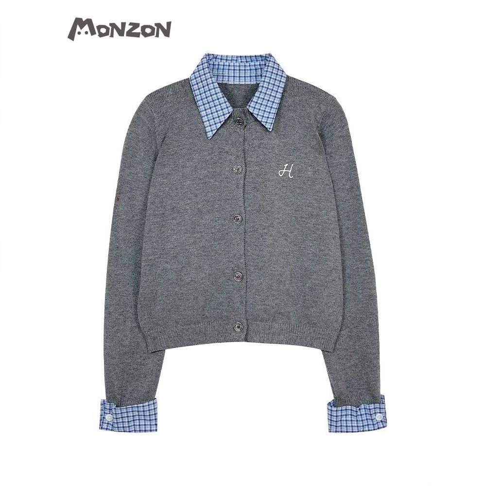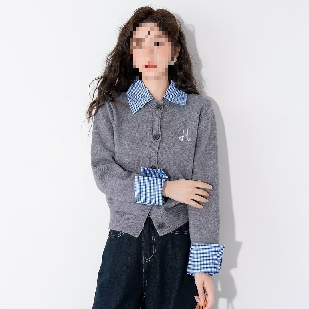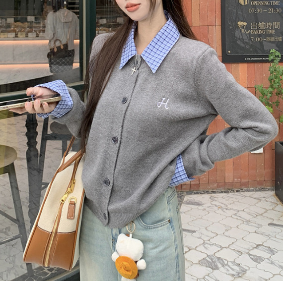 格子拼接假两件针织衫女秋冬新款别致刺绣宽松学院风长袖开衫毛衣