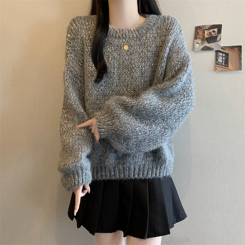 韓国スタイルの女性用ミドル丈セーター、2025年秋冬新作セーター、ゆったりとした韓国スタイルのレイジースタイルラウンドネックトップ