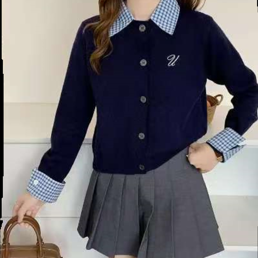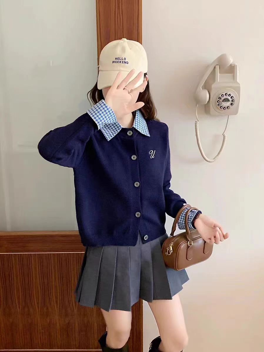 假两件针织开衫新款复古英伦风穿搭显瘦设计感格子拼接上衣