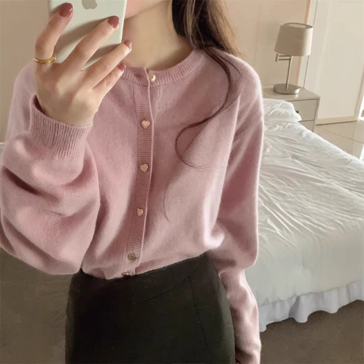 秋冬季温柔风爱心纽扣羊毛开衫外套女粉色毛衣显瘦百搭针织衫上衣