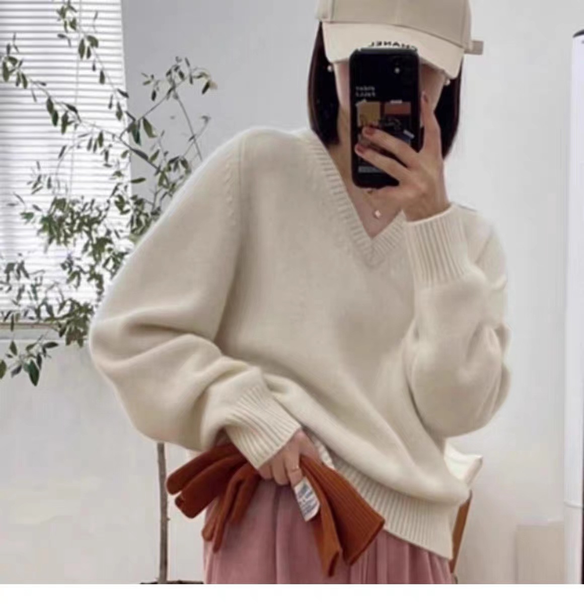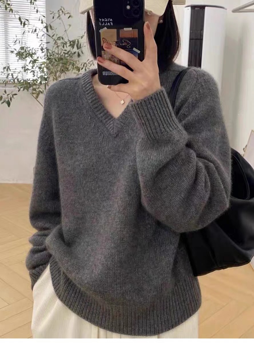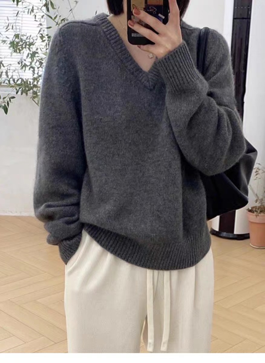 25秋冬新作Vネックウール麻編みセーター女性用ゆったりスタイル厚手無地大きいサイズゆったりカシミヤベースレイヤー