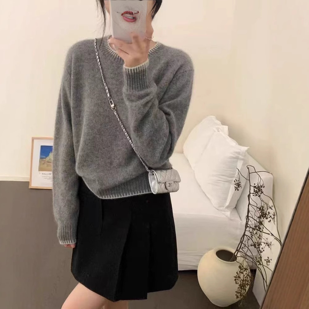 2025韩系柔软女士拼色圆领套头气质休闲简约宽松纯羊毛针织打底衫
