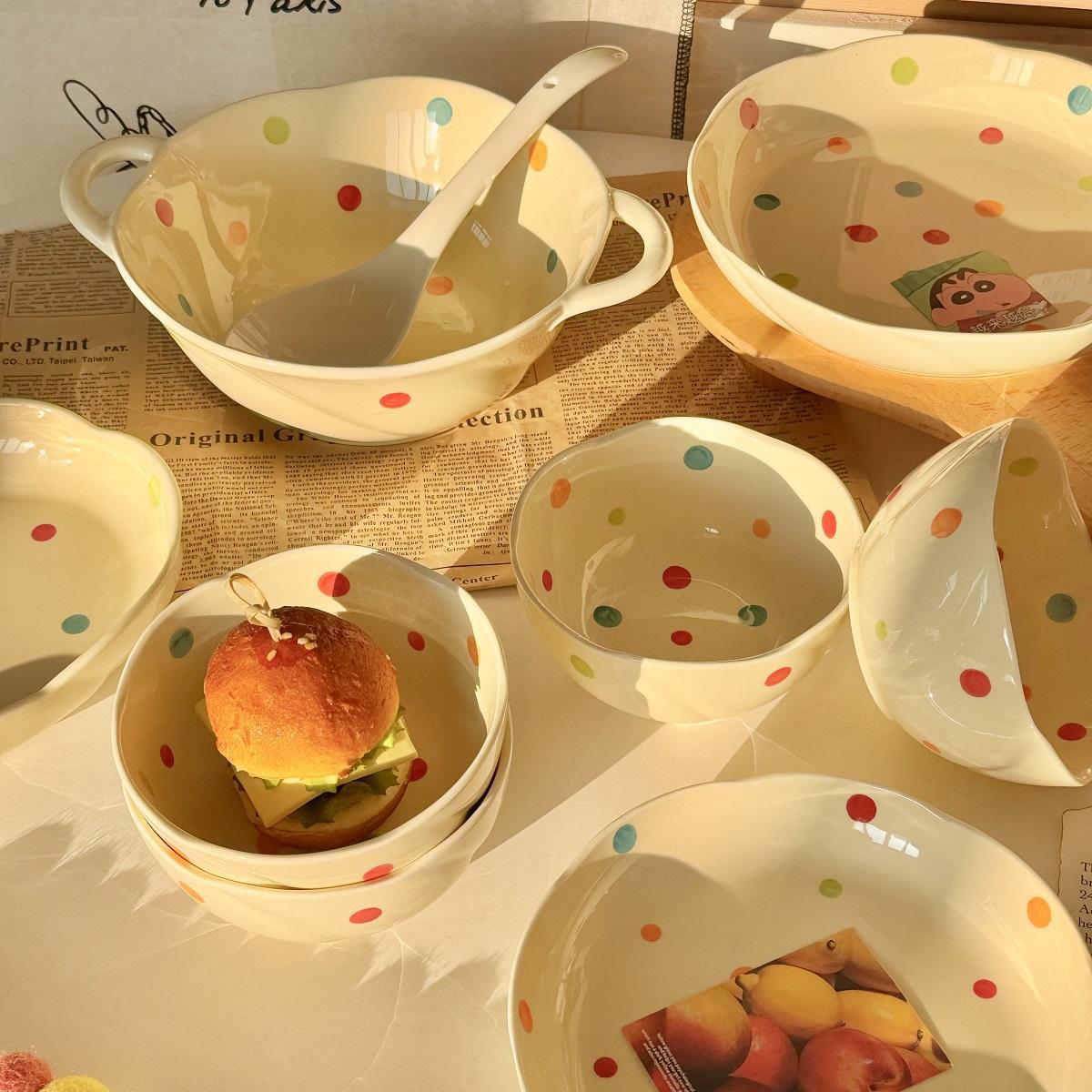 かわいい波点陶磁器食器がとてもきれいな茶碗一人食食器セット家庭用皿スープ茶碗茶碗