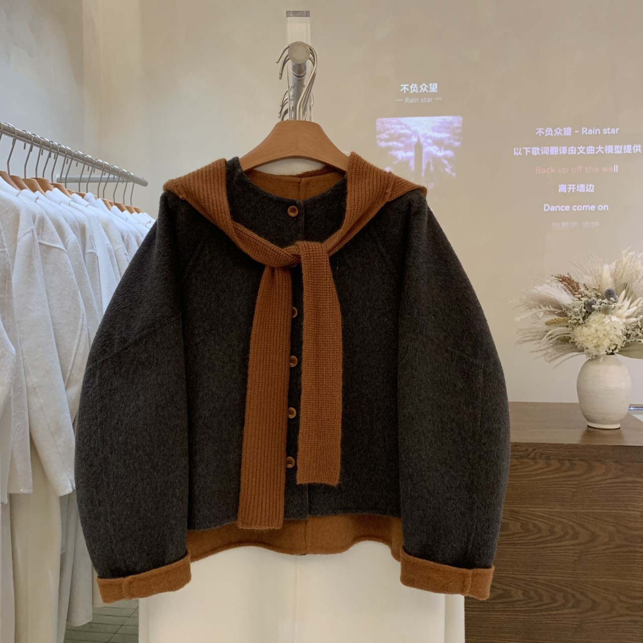 厂家直销撞色可拆卸围巾帽毛呢外套2025新款双面羊毛大衣女短款潮