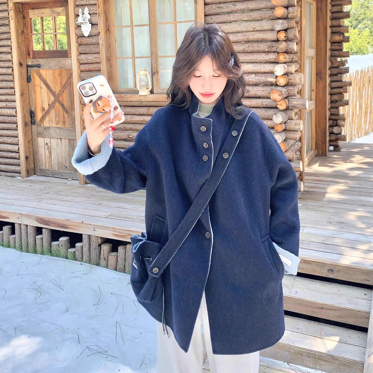 厂家直销新中式国风双面羊绒大衣女短款2025新款撞色立领毛呢外套