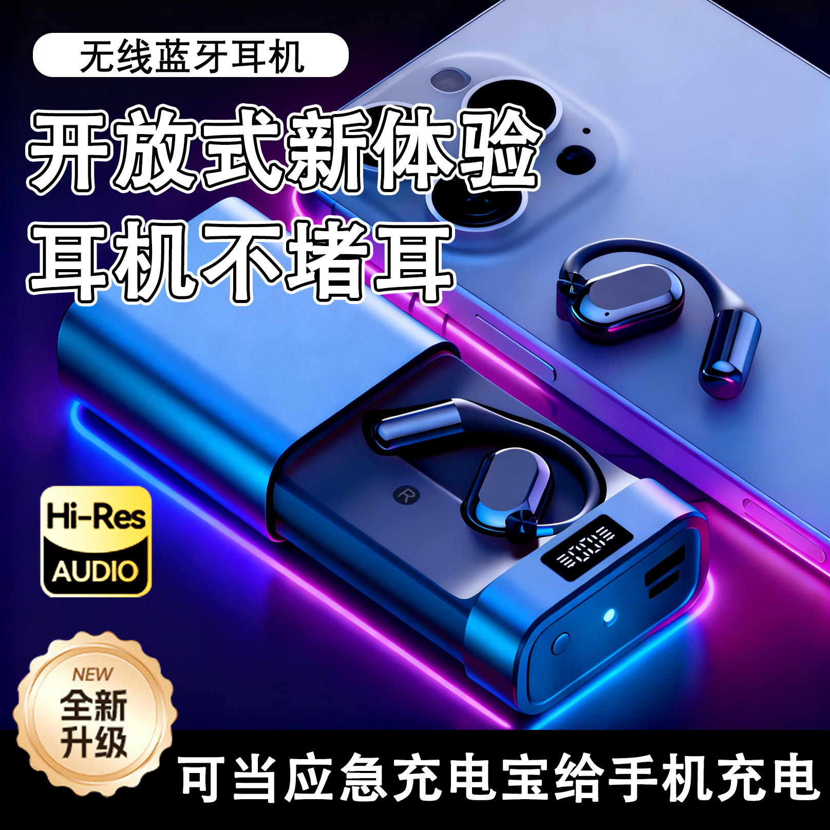 挂耳式降噪蓝牙耳机自带手电筒应急充电宝双用便携款续航大电量